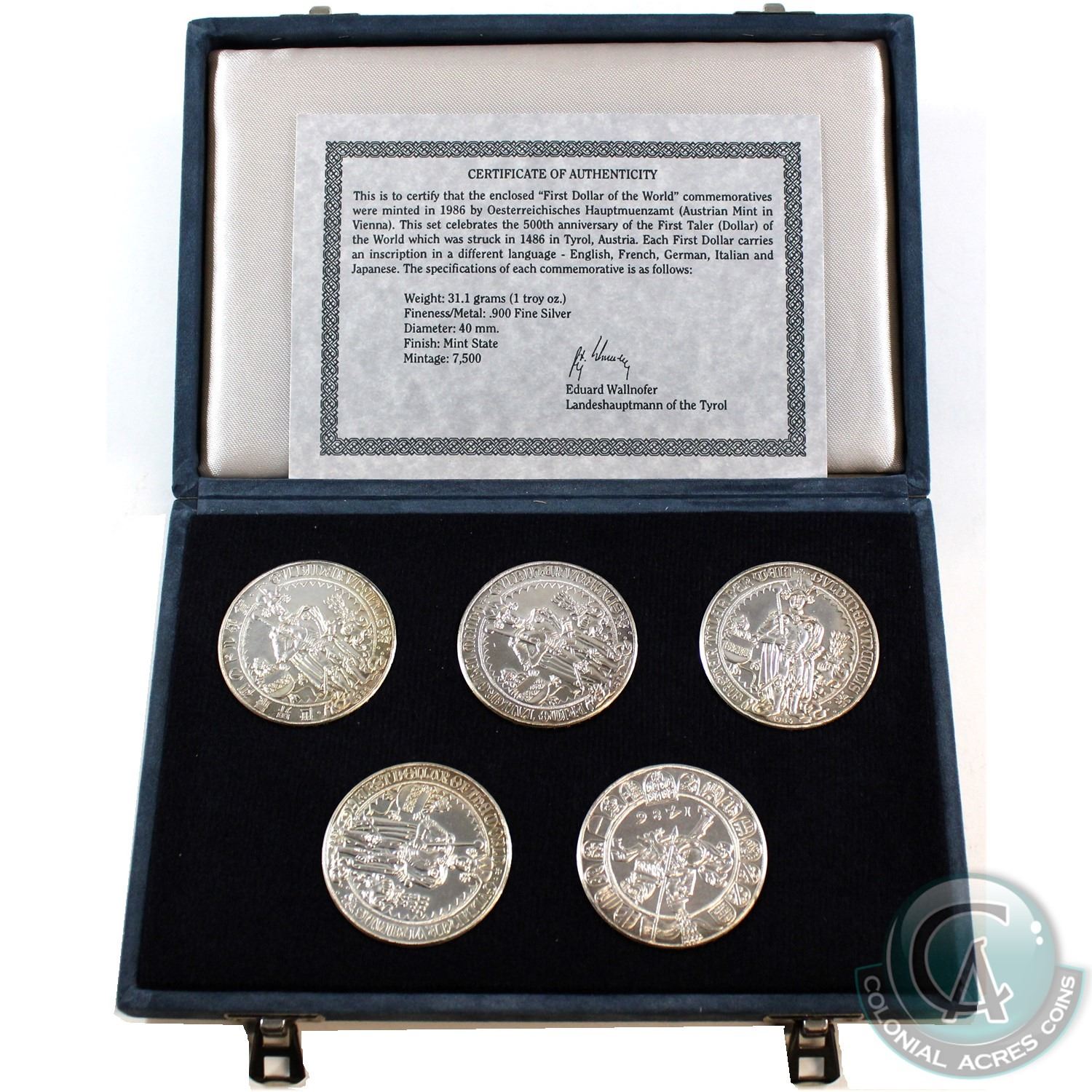 Austria Mint Issue: 1986 Limited Edition - First Dollar of the World Silver 5-coin Set. Each coin is .900 Fine Silver with a limited mintage of 7500 sets Issued. Please note coins contain natural toning.