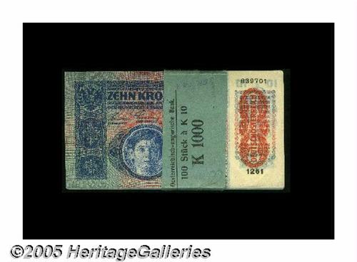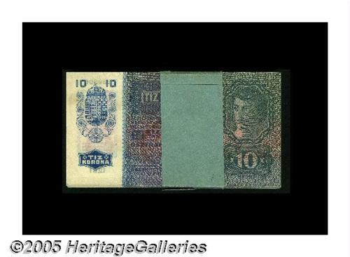 <B>Austria</B></I> Original Pack of 100 10 Kronen Pick 51a<BR>This pack is strapped within an Austrian-Hungarian Bank band for 100 pieces. The band is hand stamped April 8, 1922. <B>Crisp Uncirculated.</B></I><BR>
