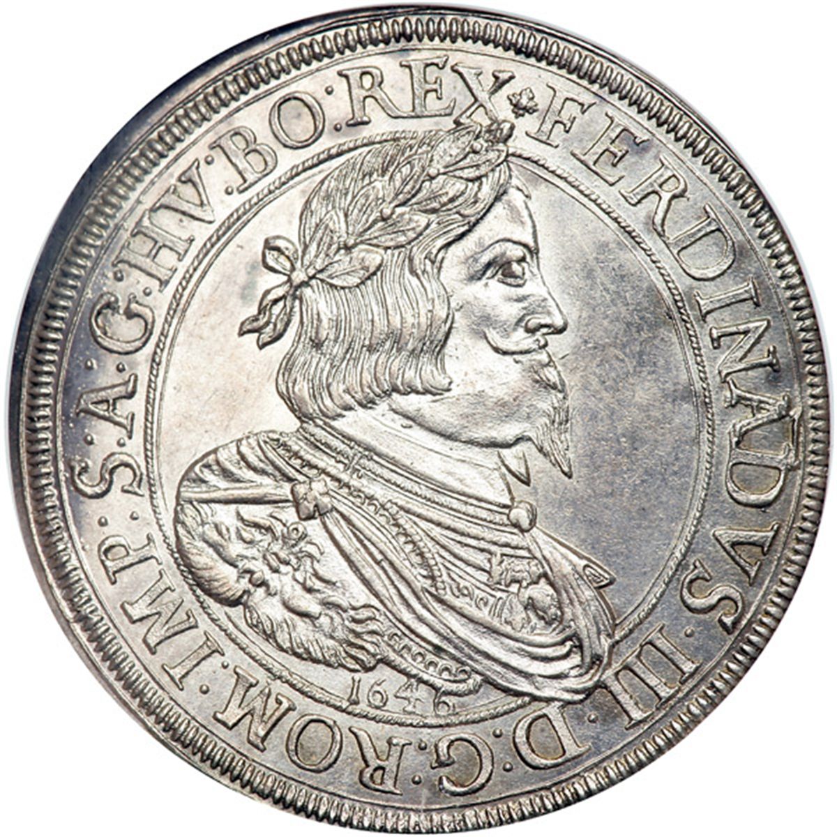 Austria. Taler, 1646 (Graz). Dav-3189. Ferdinand III, 1637-1657. Laureate head right. Reverse: Crowned arms in Order chain. Struck on roller die. Sharply struck with reflective fields. NGC graded MS-64.