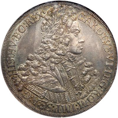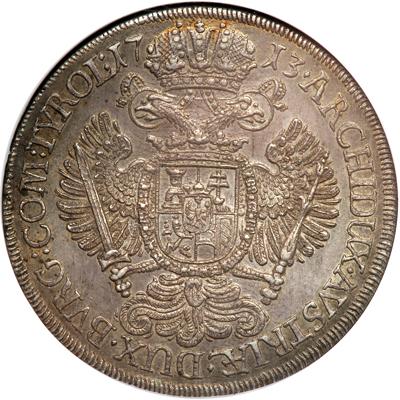 Austria. Taler, 1713 (Hall). Dav-1050; KM-1552. Charles VI, 1711-1740. Laureate bust right. Reverse: Crowned double eagle with arms. Lustrous with light gray tone. NGC graded AU-58.
