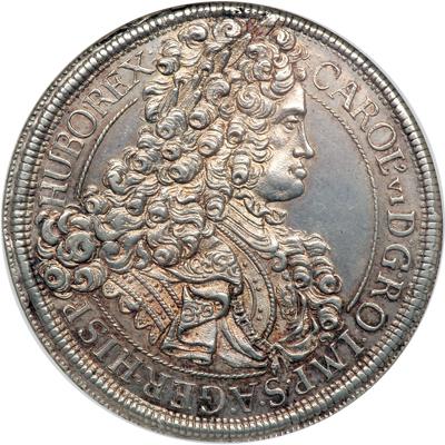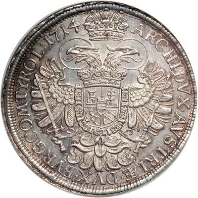Austria. Taler, 1714 (Vienna). Dav-1035; KM-1522. Charles VI, 1711-1740. Large laureate bust in beaded border right. Reverse: Crowned double eagle with arms. Sharply struck with original mint luster. Light golden tone. NGC graded MS-62.