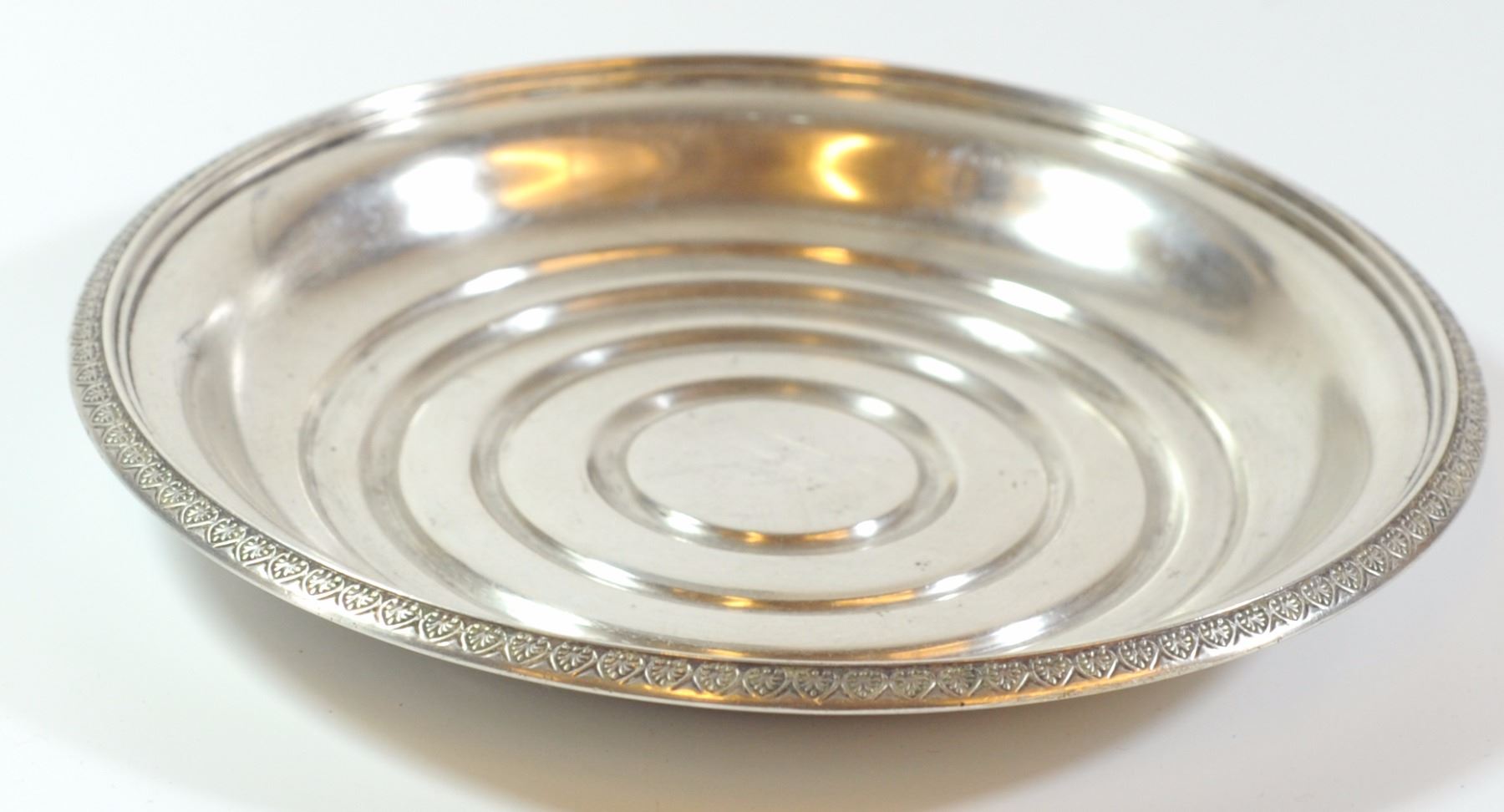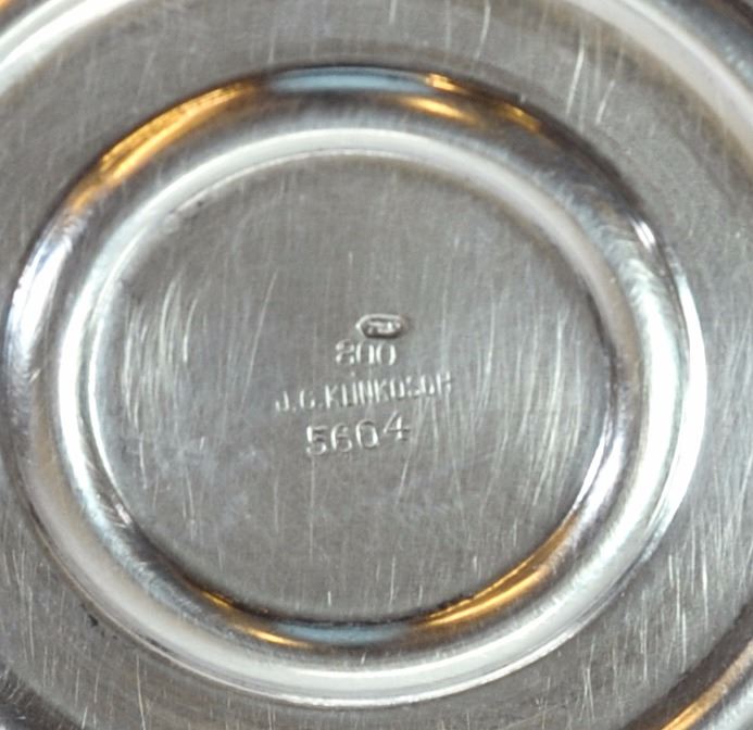 Austrian Art Deco 800 silver saucer by J.C. Klinkosch, 1920s-1930s, rim decorated with de lis Fleur flower pattern, signed with silver stamp and maker's mark, and numbered 5604. Weight: 169 gm, diameter: 14.5 cm.