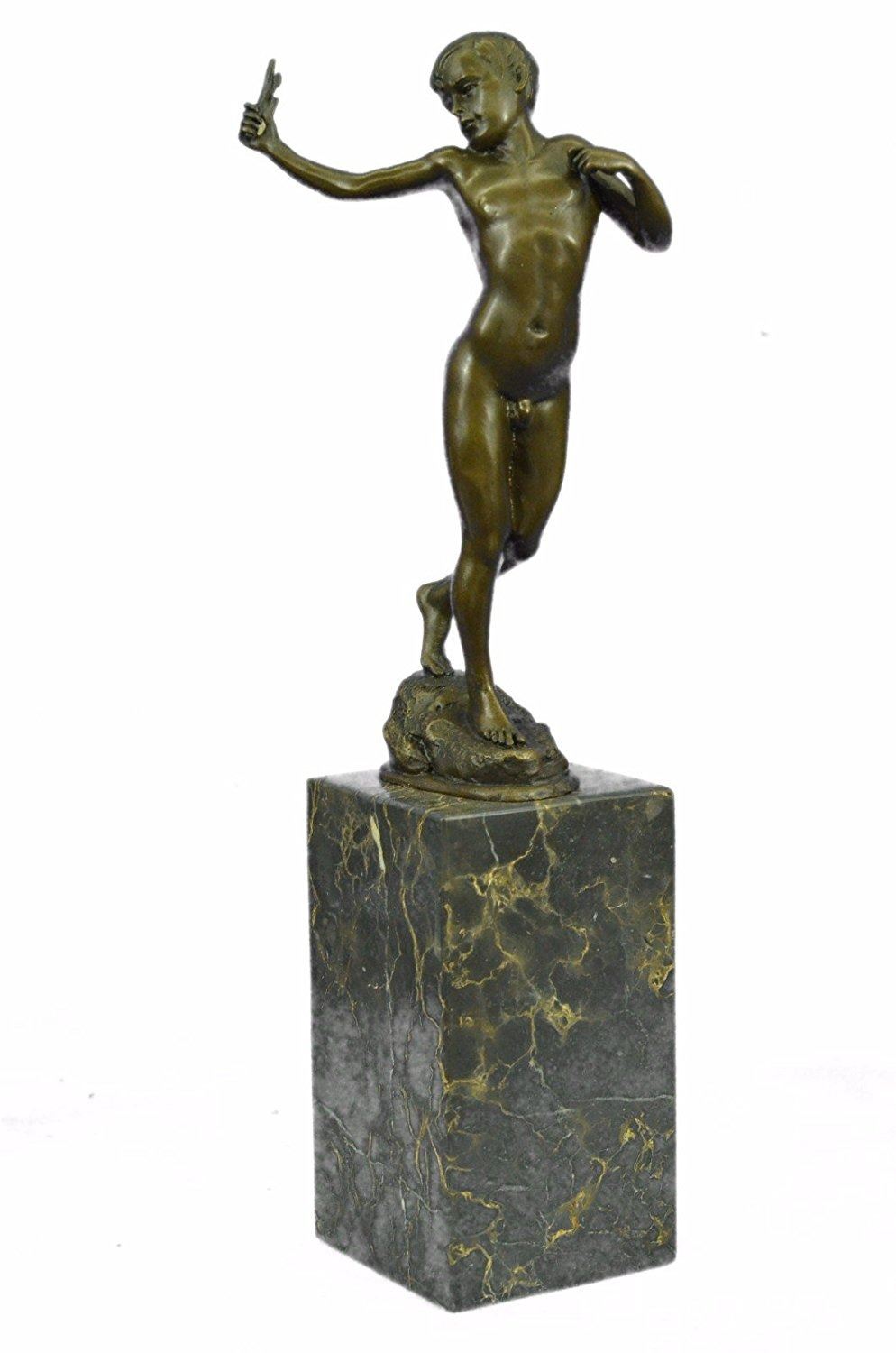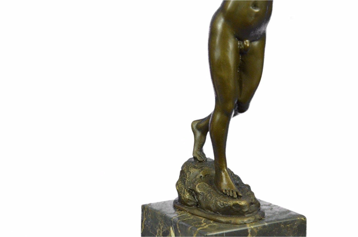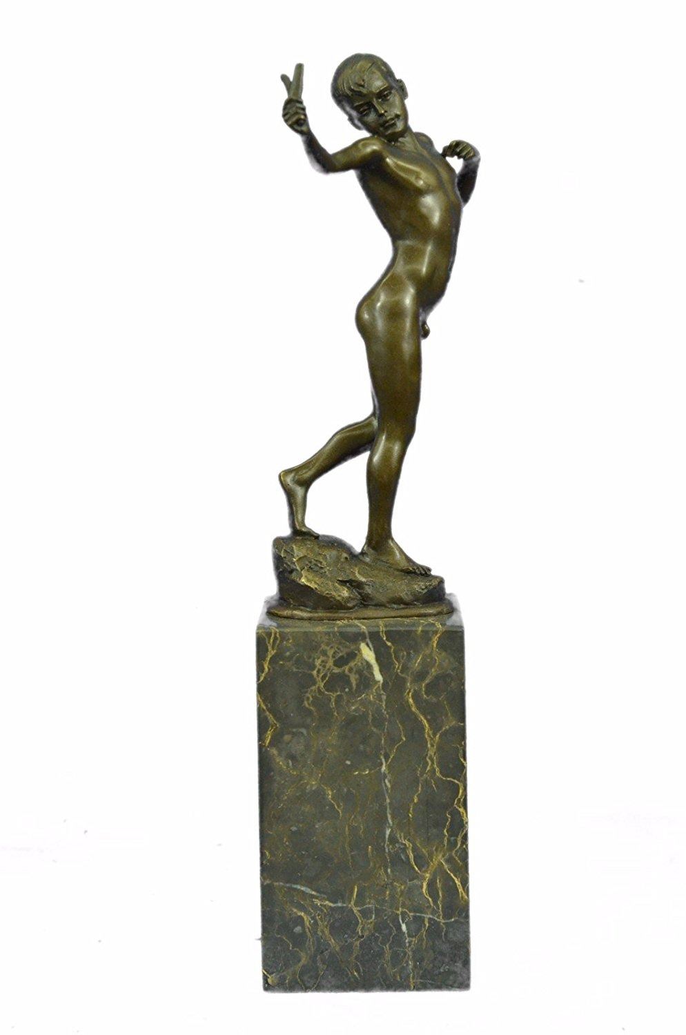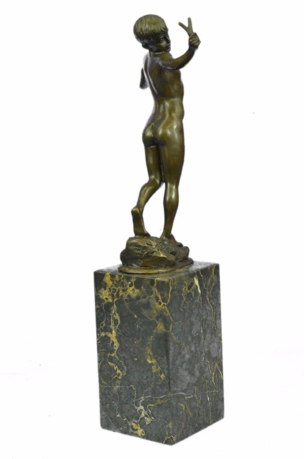 He is an artist's muse. He shows off his masculine, muscular body. He crouches low and stretches his arms out before him. He claps his hands tightly and bows his head in a tucked position. The detail of this sculpture is in the lines of his body. He is a symbol or strength and tranquility. 100% bronze and handmade, this brown patina sculpture was cast using the Lost Wax Method and mounted on a marble base. Bronze Dimensions with Marble Base: Height 13 X Width 5 inches. Weight: 8 LBS. Inventory: 71-B7182317