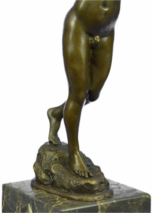 He is an artist's muse. He shows off his masculine, muscular body. He crouches low and stretches his arms out before him. He claps his hands tightly and bows his head in a tucked position. The detail of this sculpture is in the lines of his body. He is a symbol or strength and tranquility. 100% bronze and handmade, this brown patina sculpture was cast using the Lost Wax Method and mounted on a marble base. Bronze Dimensions with Marble Base: Height 13 X Width 5 inches. Weight: 8 LBS. Inventory: 71-B7182317