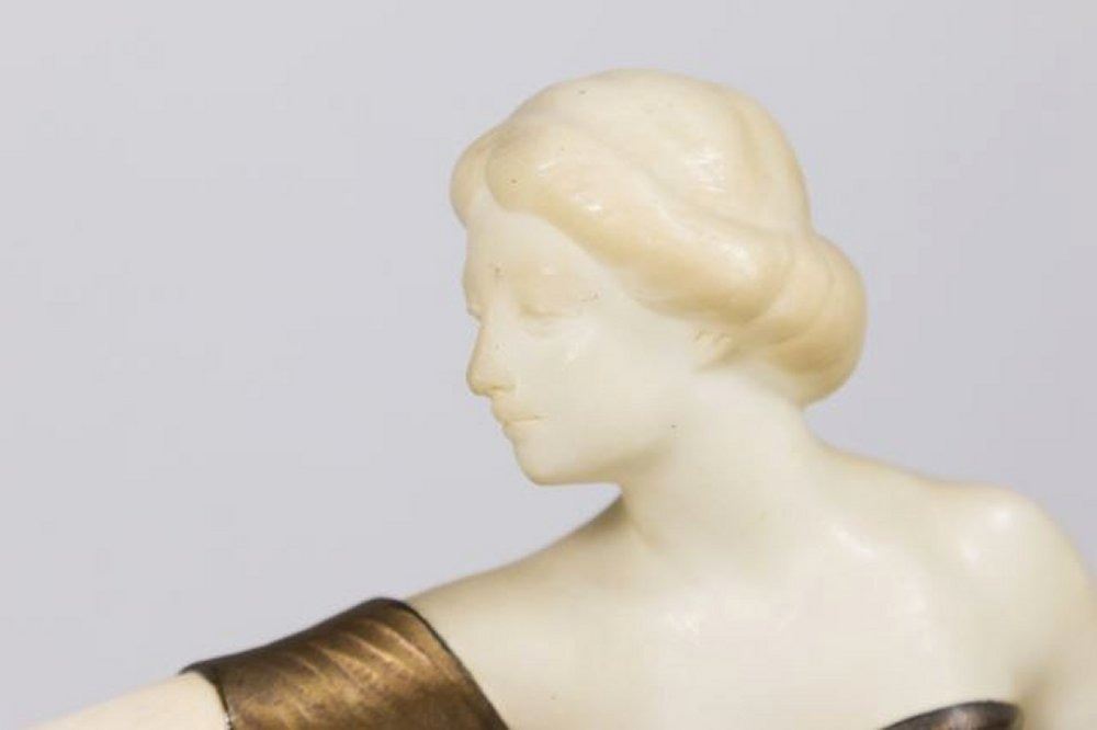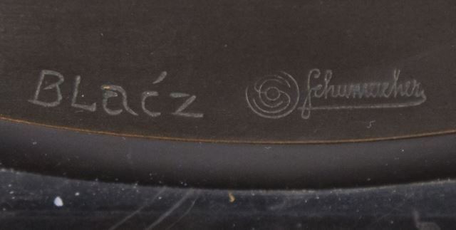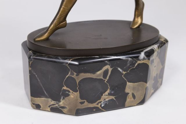 Circa 1920s. Signed Blacz. Foundry Schumacher. Mounted on black marble base. Approx. 14 1/4" H. Hands repaired.
