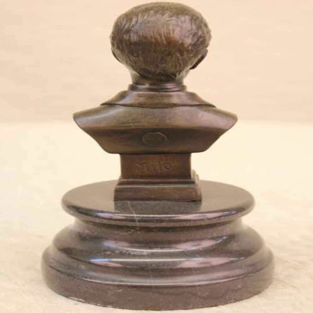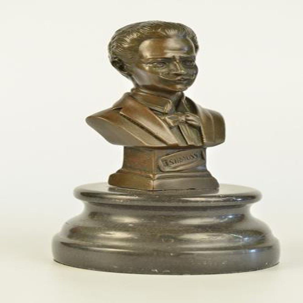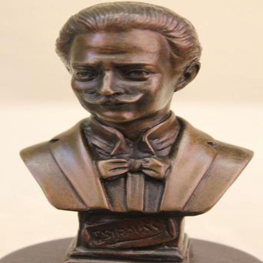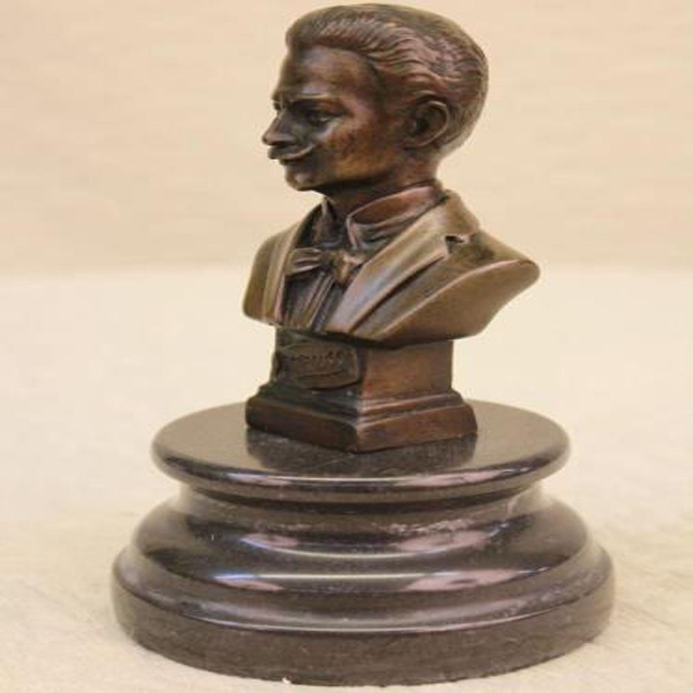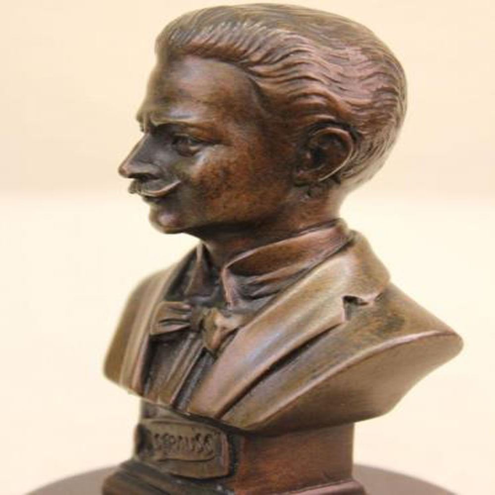 This Bronze bust honors the memory of Austrian composer Johann Strauss I (1804 - 1849). He was one of Europe leading conductors and composers of over 300 works of dance music and establishing his reputation as a composer of Viennese waltzes. Not only fathering music he bore a son, J. Strauss Jr. (October 25, 1825 - June 03, 1899), who carried his name and musical talent. He is brilliantly cast in his elegant likeness. His face is cast down as he enigmatically smiles upon his musings. He sports an evening coat and a finely detailed bow tie. This Bronze plinth bears his eternal name. J. Strauss was cast using the archaic methods of lost wax casting and finished with a brown patina stain. Bronze Dimensions with Marble Base: Height 7 X Width 4 inches. Weight: 5 LBS.