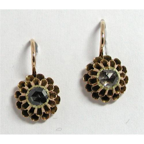 1870s Austrian gold and rose cut diamond earrings. The hallmarks are on the earwire. 10mm diameter and hangs 18mm from the top of the earwire.