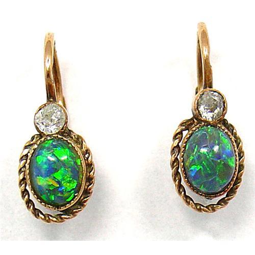 Tiny but exceptional quality 14 Kt. yellow gold earrings with Austrian hallmarks and makers marks from the 1890s. The earrings are set with oval 4mm x 5.5mm Australian black opals and round old mine cut diamonds approximately 0.10 total weights. The length of the earrings is 5/8", to top.