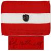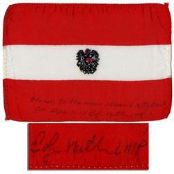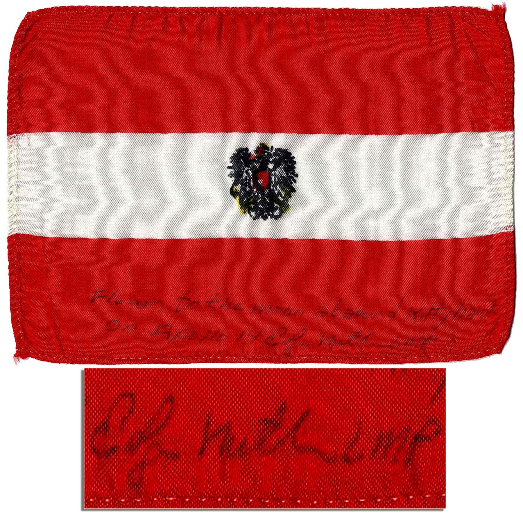 Apollo 14 flown Austrian flag, carried aboard the spacecraft Kittyhawk by its Lunar Module Pilot Edgar Mitchell. Red and white 6'' x 4'' flag is signed ''Edgar Mitchell LMP'' who additionally writes ''Flown to the moon aboard Kittyhawk Apollo 14''. Mitchell also writes in the accompanying COA, ''The accompanying flag was flown aboard the spacecraft Kittyhawk on the Apollo 14 expedition to the moon which launched January 31, 1971…I hope that this historic piece will bring pleasure to viewers for many years…[signed] Edgar Mitchell''. Fine.