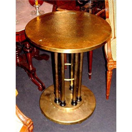 Viennese , Fine Josef Hoffmann table, circular hammered brass top and circular bottom supported by eight dowel legs with geometric design, in very good original conditions , 23"dia. x 30"h , The design , style , and materials used ,are exactly the same used for the Woka Lamp Josef designed in 1901 , so I think this design has been made close to 1900,also,is well know around 1900 Hoffmann developed his geometrically refined style, elegant and perfectly unified, that he incorporated in designs for furniture, ,It is not signed, Hoffmann was a designer, not a manufacturer. VERY RARE TO FIND !