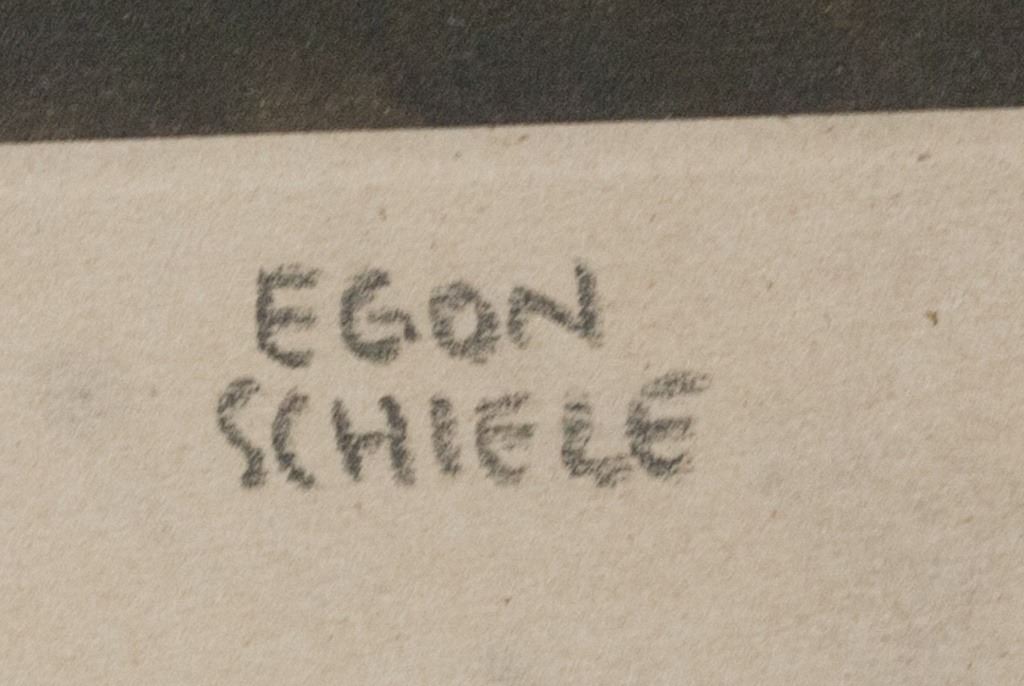Linocut on paper. Featuring a man sitting in a chair with his elbow resting on a armrest while his hand props up his head. Signed "EGON SCHIELE" to the bottom right. Image size: 21 x 16 cm (8.3 x 6.3 inches). Sheet size: 29.5 x 20.5 cm (11.6 x 8.1 inches).