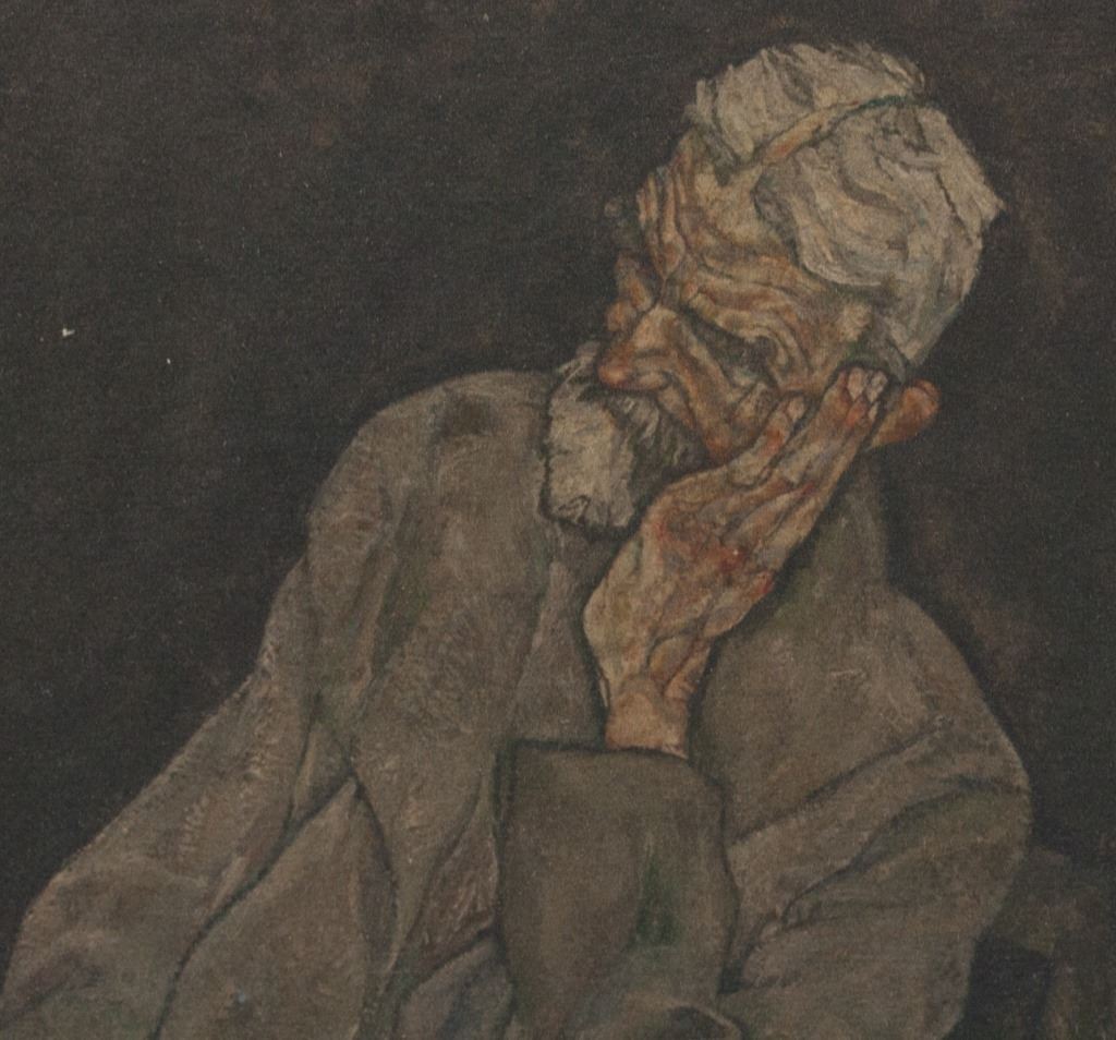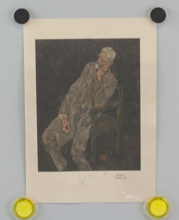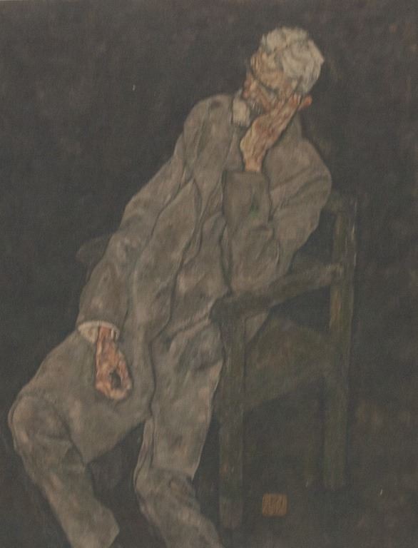 Linocut on paper. Featuring a man sitting in a chair with his elbow resting on a armrest while his hand props up his head. Signed "EGON SCHIELE" to the bottom right. Image size: 21 x 16 cm (8.3 x 6.3 inches). Sheet size: 29.5 x 20.5 cm (11.6 x 8.1 inches).