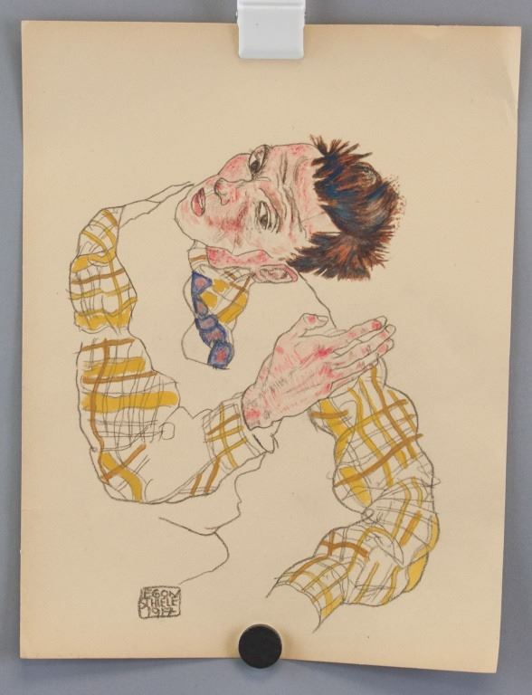 Mixed media on paper. Featuring a main in yellow plaid. Signed "EGON SCHIELE" to the bottom left, with "1917" inscribed beneath the signature. 35.5 x 27 cm (14 x 10.7 inch).