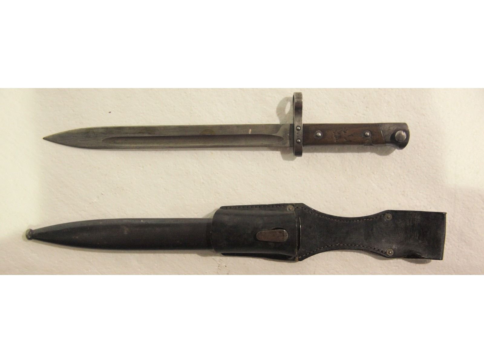 Blade measures 9.75", overall 15". CEWG on blade. 89 on cross guard. Some nicks to grips but in overall good condition. German scabbard marked Herder 1940. #1468. Nice black leather frog.