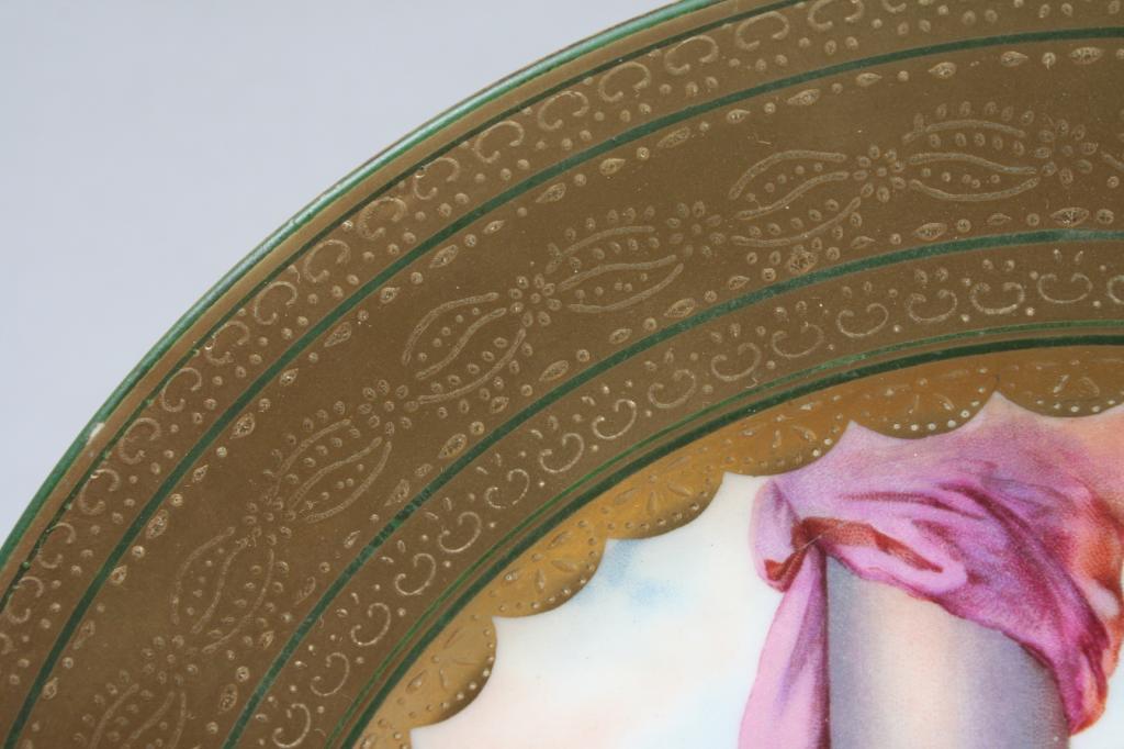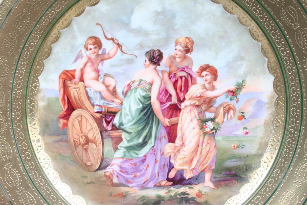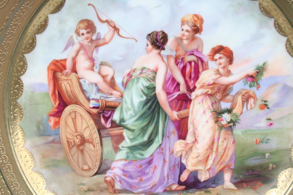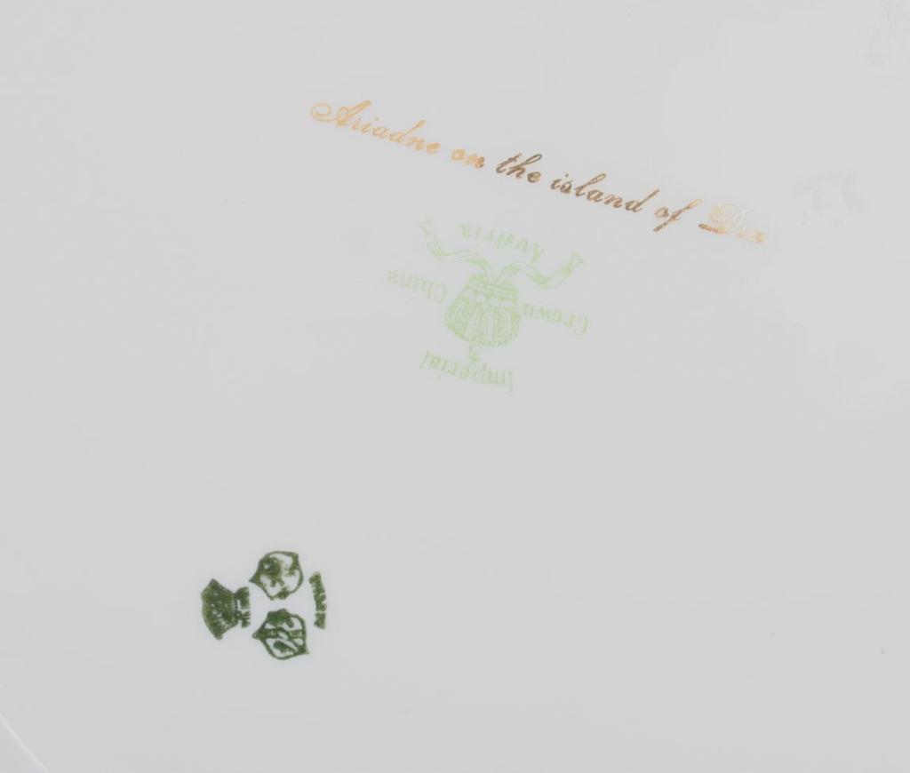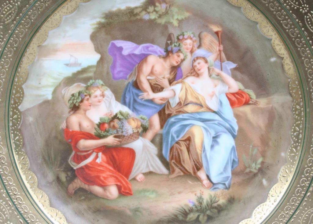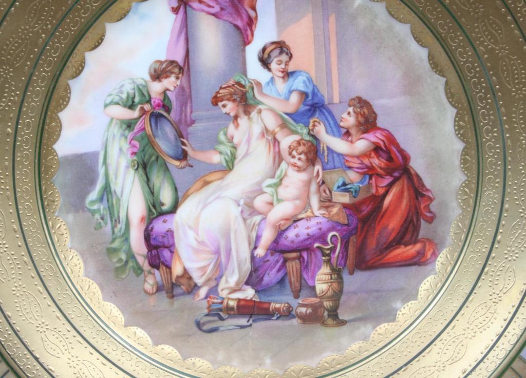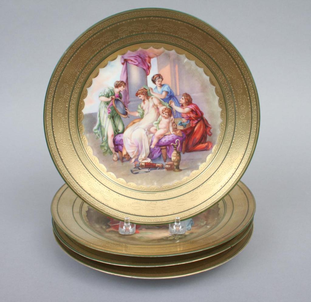 By Imperial Crown China, Austria, comprising four plates decorated in the Neoclassical style taste, including "The Toilet of Venus", "Ariadne on the Isle of Dia", and two "The Triumph of Love", each enclosed within a heavily gilt and tooled band, the verso stamped in green with the company logo, gilt titles, and impressed TK 78. 9 1/2"D. Condition: a few very light scratches, otherwise excellent.