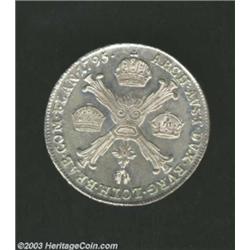 <TABLE cellSpacing=0 cellPadding=0 width="100%" bgColor=#000000 border=0><TBODY> <TR><TD width="100%"><TABLE cellSpacing=1 cellPadding=3 width="100%" border=0><TBODY><TR><TD width="100%" bgColor=#79735c><FONT face=arial color=#ffffff size=3><B>Description</B> </FONT></TD></TR><TR><TD width="100%" bgColor=#ffffff><FONT face=arial size=2><B>Austrian Netherlands. Franz II 1/4 Kronenthaler 1795B,</B></I> Bust right/Cross, KM60, BU. </FONT></TD></TR></TBODY></TABLE></TD></TR></TBODY></TABLE><BR><A name=PricesRealized></A><TABLE cellSpacing=0 cellPadding=0 width="100%" bgColor=#000000 border=0><TBODY><TR><TD width="100%"><TABLE cellSpacing=1 cellPadding=3 width="100%" border=0><TBODY><TR><TD width="100%" bgColor=#79735c><A name=PR><FONT face=arial color=#ffffff size=3><B>Previous Prices from Heritage Auctions</B> </FONT></A></TD></TR><TR><TD bgColor=#f6f6ed>No Prior Data Recorded </TD></TR><TR><TD bgColor=#ffffff><FONT face=arial size=1 ?>PLEASE NOTE: All prices realized reflect the final hammer price PLUS the buyer's premium in auctions that charge a buyer's premium. Each item has a notation at the top of the listing indicating whether that lot included a buyer's premium. Example: A item that sells with a final hammer price of $100 and a 20% buyer's premium will display with a price realized of $120. All information listed is intended to be as accurate as possible, but errors are possible. Please use this guide carefully and inform us of any inaccuracies. </FONT></TD></TR></TBODY></TABLE></TD></TR></TBODY></TABLE><BR><TABLE cellSpacing=0 cellPadding=0 width="100%" bgColor=#000000 border=0><TBODY><TR><TD width="100%"><TABLE cellSpacing=1 cellPadding=3 width="100%" border=0><TBODY><TR><TD width="100%" bgColor=#79735c colSpan=6><FONT face=arial color=#ffffff size=3><B>Price Guide*</B> </FONT></TD></TR><TR bgColor=#f6f6ed><TD align=middle><B>Grade</B> </TD><TD align=middle><B>Coin World<BR>(Trends)</B> </TD><TD align=middle><B>Numismedia<BR>Retail</B> </TD><TD align=middle><B>Numismedia<BR>Wholesale</B> </TD><TD align=middle><B>Coin<BR>Universe</B> </TD><TD align=middle><B>Heritage<BR>Value Index</B> </TD></TR><TR bgColor=#ffffff><TD colSpan=6><FONT size=1>*All information listed is intended to be as accurate as possible, but errors are possible. No item may be returned or refused based on this information which is provided as a service to our customers. You should contact each pricing source directly to determine the accuracy of this information. </FONT></TD></TR></TBODY></TABLE></TD></TR></TBODY></TABLE><BR><TABLE cellSpacing=0 cellPadding=0 width="100%" bgColor=#000000 border=0><TBODY><TR><TD width="100%"><TABLE cellSpacing=1 cellPadding=3 width="100%" border=0><TBODY><TR><TD width="100%" bgColor=#79735c><FONT face=arial color=#ffffff size=3><B>Population Guide</B> </FONT></TD></TR><TR bgColor=#ffffff> Important notice: Heritage usually auctions material at the rate of 200-250 lots per hour. On some occasions eBay Live bid software or the Internet may not be able to keep up with the pace of the auction. We recommend placing a realistic absentee bid now as insurance to avoid disappointment. Occasionally the auctioneer may eliminate or reject an eBay Live bid, and the auctioneer may also reopen a lot after the close of the eBay live bidding (usually because we missed an audience bid), and may reject your bid even if it shows you as the winning bidder. By bidding via eBay Live, you agree that Heritage may award the lot to another bidder at its sole discretion under the circumstances described above or any other reasonable circumstances. Also please note that all Heritage lots purchased through eBay Live carry a 20% Buyer's Premium. Please make sure you read the Terms and Conditions before you bid.</TD></TR></TBODY></TABLE></TD></TR></TBODY></TABLE>