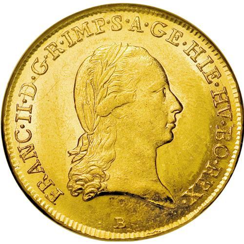 <B>Austrian Netherlands. Franz II gold Souverain d'Or 1796B, </B></I>KM64, MS63 NGC, bright and lustrous with just a bit of superficial encrustation on the reverse shield.