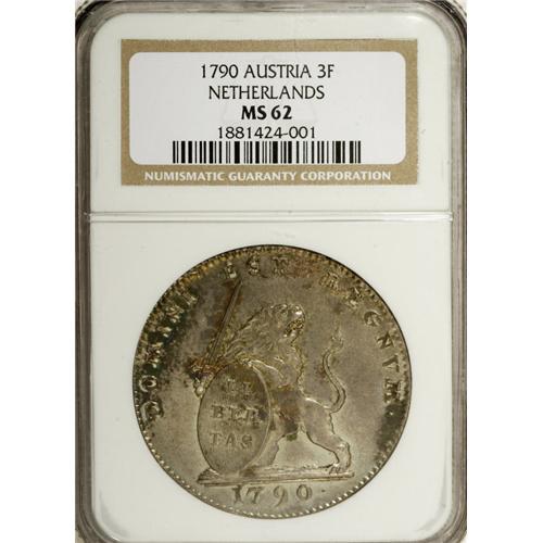 <B>Austrian Netherlands. Leopold II Insurrection 3 Florins (Lion d'Argent) 1790, </B></I>KM50, Davenport 1285, MS62 NGC, a choice toned example of this popular type struck at Brussels. Fully original, mint state specimens are seldom encountered in the marketplace.<BR><BR><b>Shipping:</b> Coin/Currency (<a target="_blank" href="http://www.heritageauctions.com/common/shipping.php">view shipping information</a>)