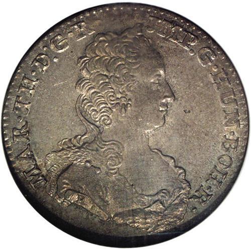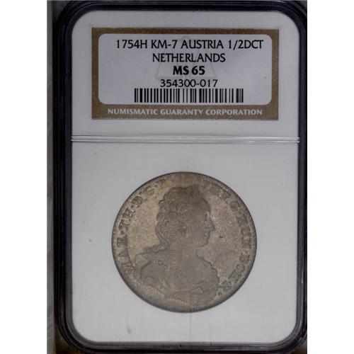 <B>Austrian Netherlands. Maria Theresa 1/2 Ducaton 1754H, </B></I>KM7, MS65 NGC, with light to medium even silvery gold toning. A very attractive coin.