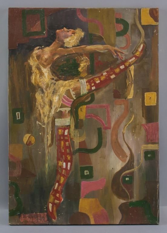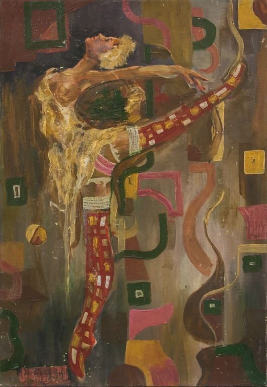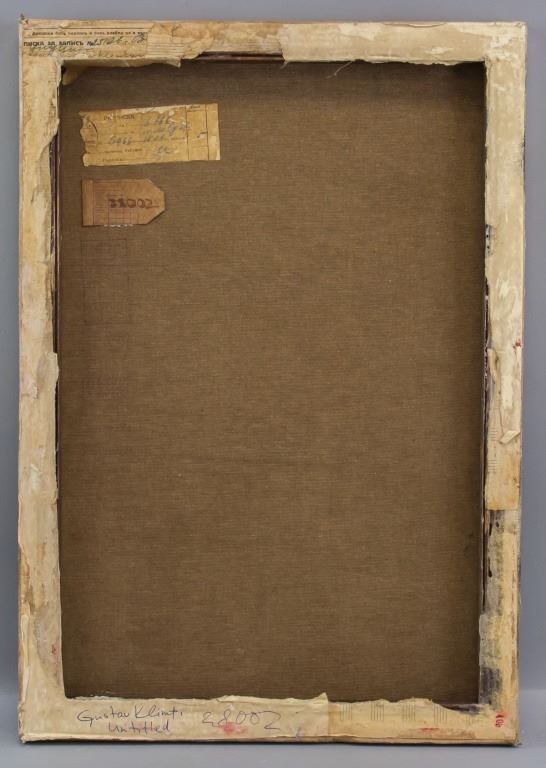 Oil on canvas. Featuring dancer dressed in red and gold. Inscribed "GUSTAV KLIMT" in the bottom left corner. Label on verso inscribed with Cyrillic script. Second label on verso reads "LOUIS BERGER'. 50 x 35 cm (19.5 x 13.5 inches).