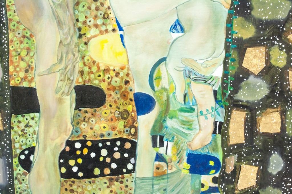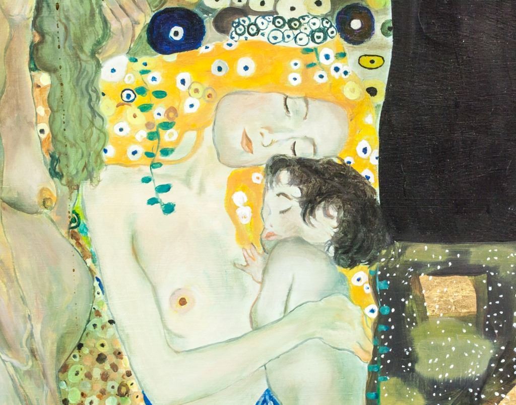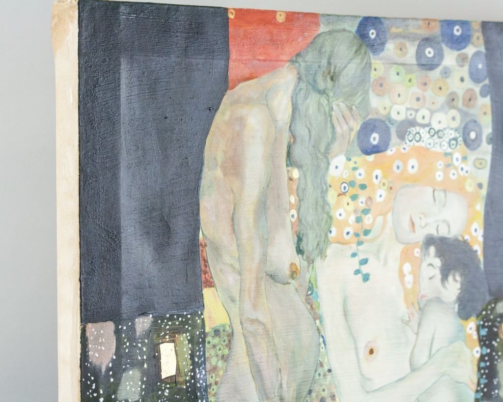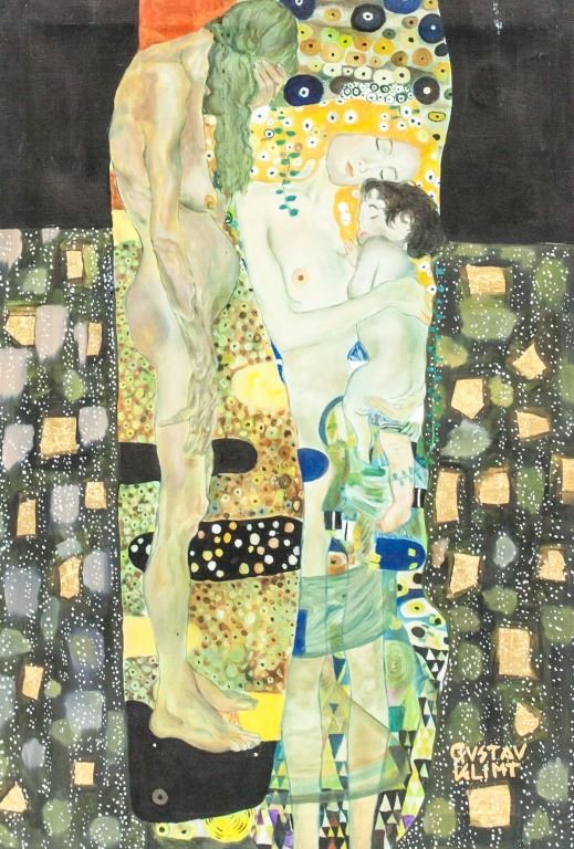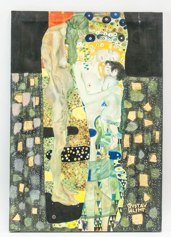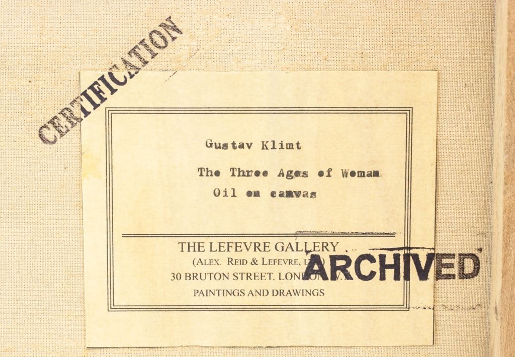 Oil on canvas. Featuring three sleeping figures in art noveau style. Signed "Gustav Klimt" to the bottom right. German stamp on verso. Label on verso reads "Gustav Klimt / The Three Ages of Woman / Oil on canvas / THE LEFEVRE GALLERY". Label stamped with "CERTIFICATION" and "ARCHIVED". 60 x 42 cm (23.75 x 16.75 in).