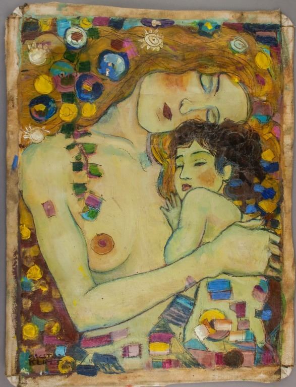 Oil on canvas. Featuring a portrait scene of a nude with child. Signed GUSTAV KLIMT on the lower left corner. Label affixed to verso inscribed, "A kiadasi allomas belyegzoje / Stempel der Empfangsstation:" and stamped below. 42 x 32.5 cm (16.5 x 12.8 inches)