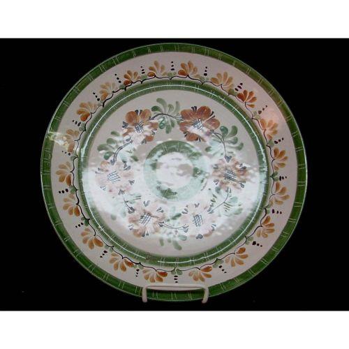 Marked with a stamp on the back, Handmade Stoob Austria and Marke Ges Gesch, green border with brown flowers on edge, large bowl measuring some 14" by 1 1/2" tall. Likely to be 1960s era. There is what appears to be an age crack or discoloration on the back side that does not come through, but I am noting it is a possibility as being a crack. This piece was made to be hung and has the old wiring for hanging.