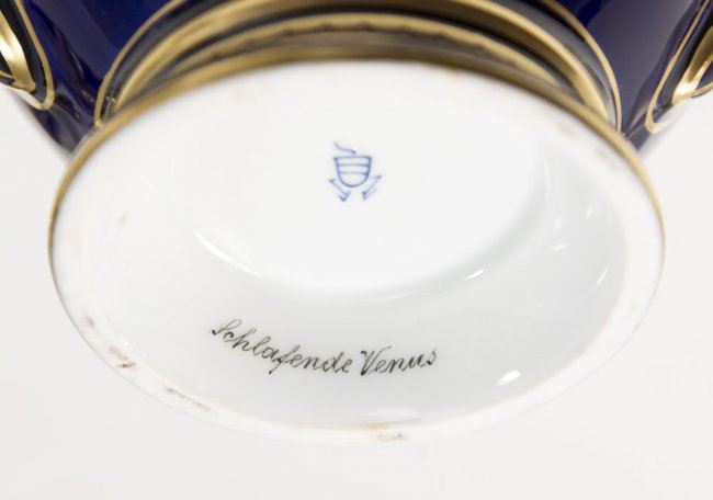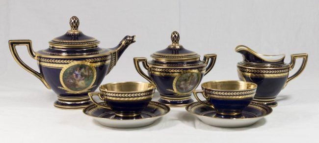 Cobalt & gold. Artist signed. Panels of women in garden scenes. Including tea pot, sugar, creamer, 2 cups & saucers. 7 pieces total. Handle on tea pot repaired.