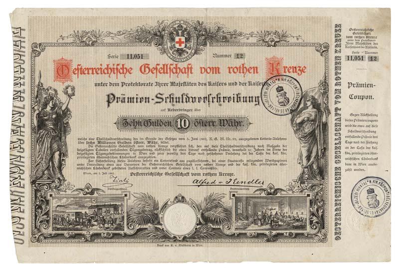 1882, Austria. Stock certificate. Black/ Red on tan paper. Multi-vignettes of allegorical figures at right and left side and small vignettes at bottom of horsedrawn ambulance and Red Cross hospital.