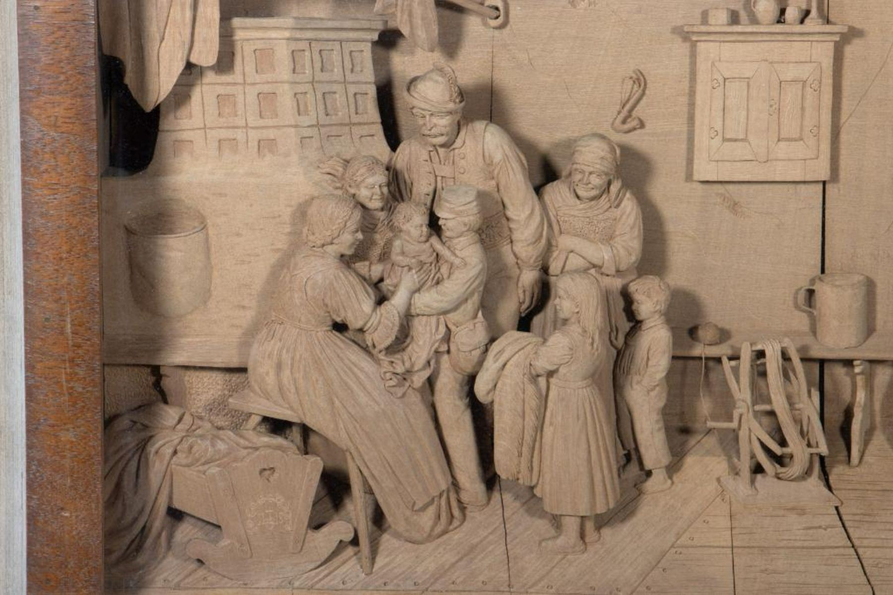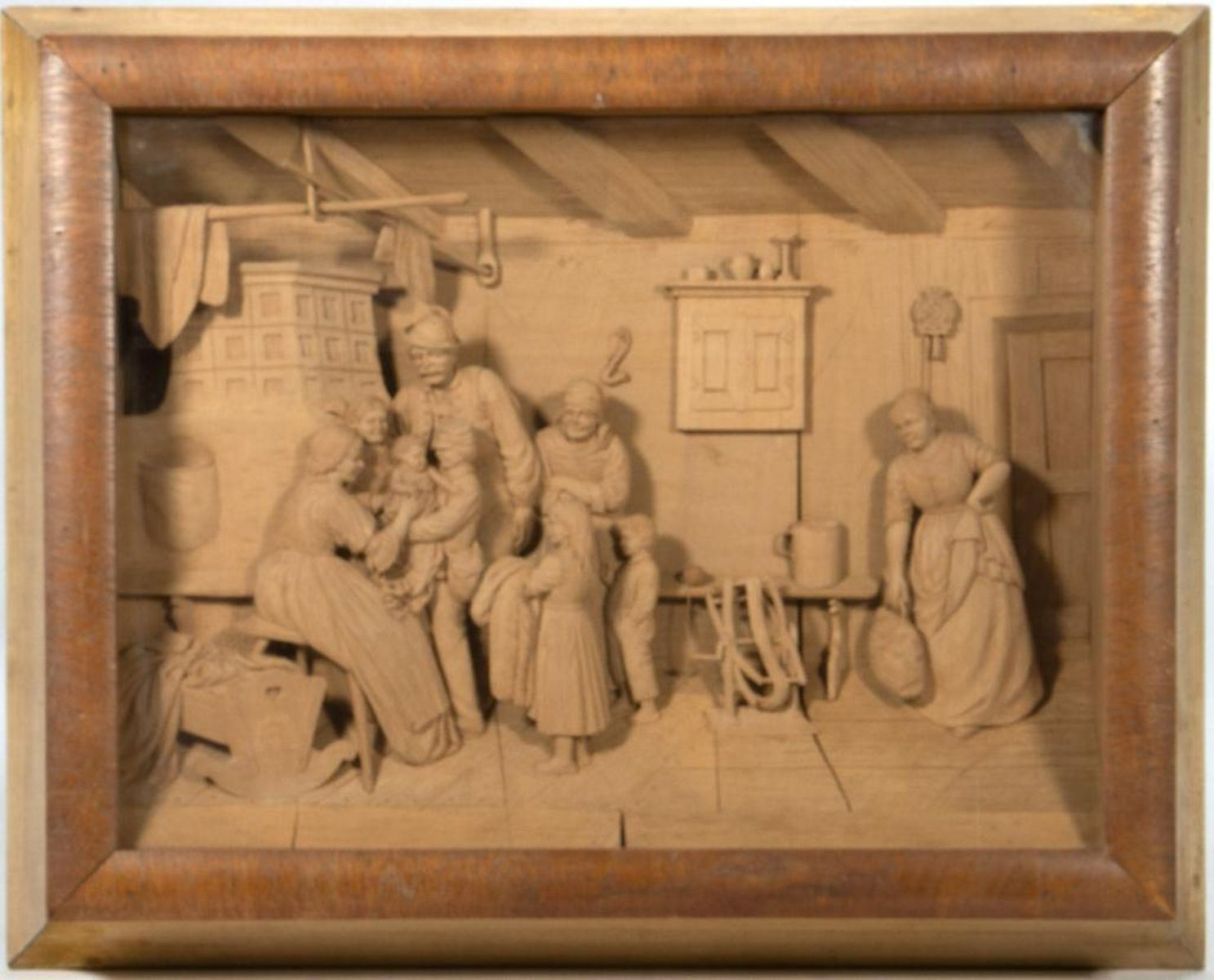 Carved wood relief depicting a domestic interior. 17in. w. 14in. l. 4in deep.