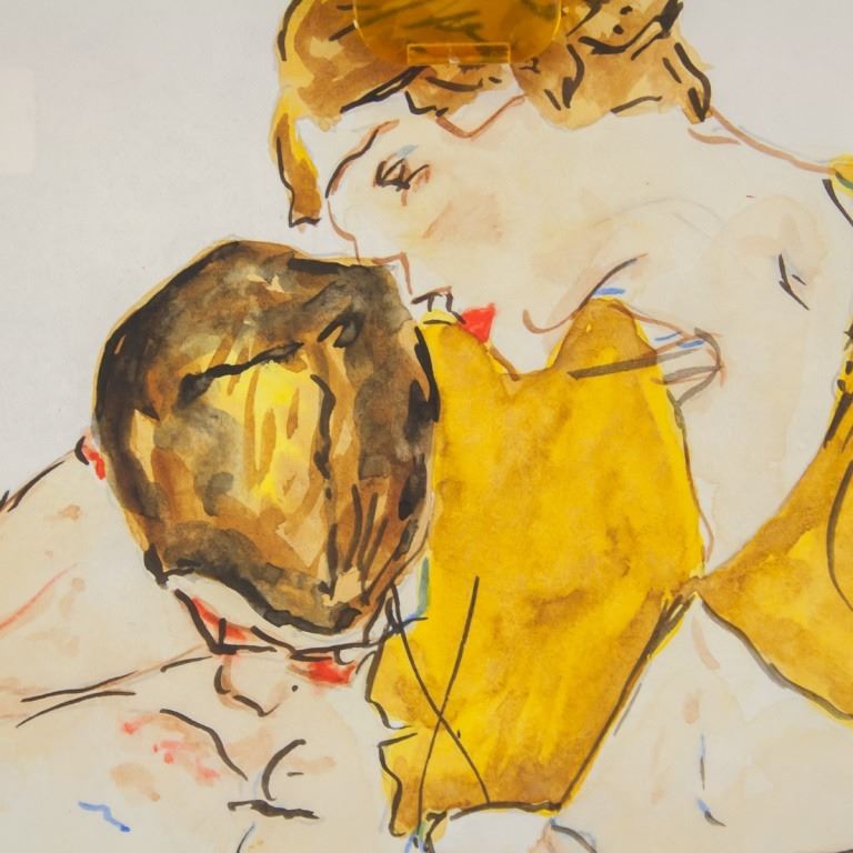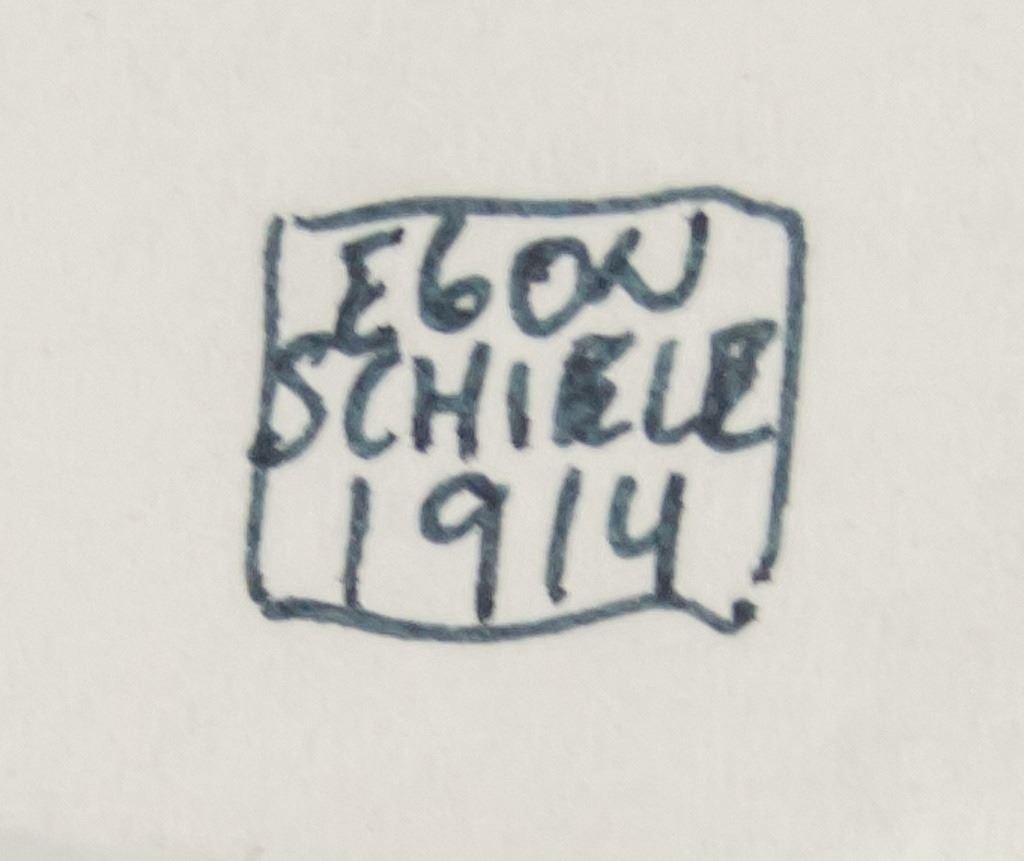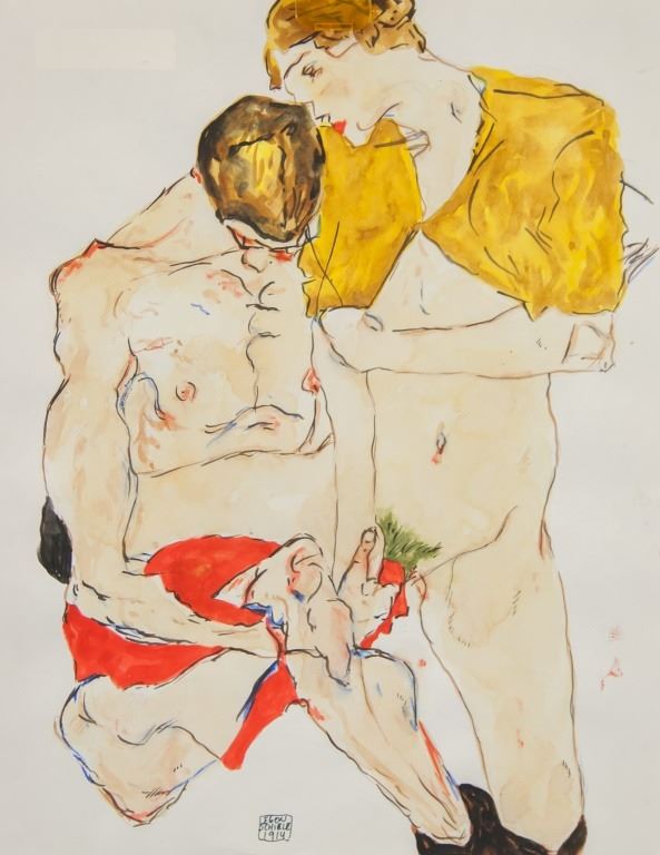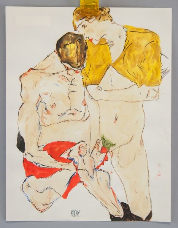 Watercolor on paper. Featuring a portrait scene of two nudes. Signed EGON SCHIELE and inscribed 1914 near the bottom portion. Stamped twice on verso. 28 x 22 cm (11 x 8.75 inches)