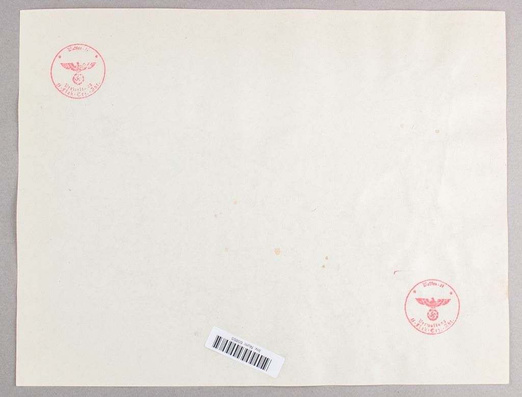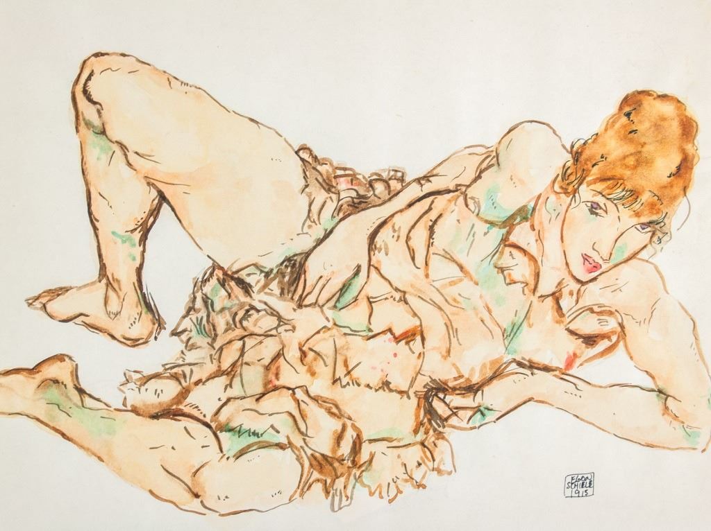 Watercolor on paper. Featuring a figure reclining on the ground on their side. Signed "EGON SCHIELE" to the bottom right with date 1915. Red stamp on verso with "Waffen-SS" and Nazi eagle and Swastika. 28 x 23 cm (11 x 9 inches).