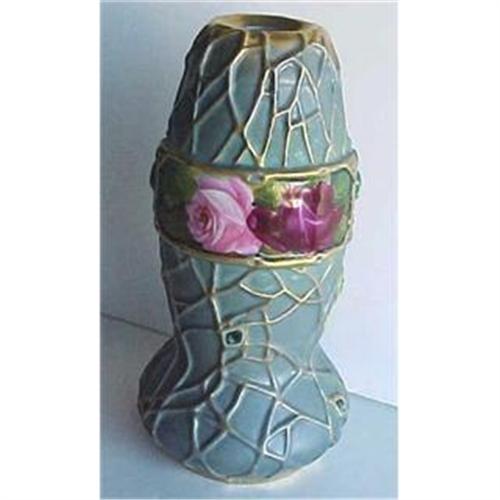 This is a Austrian amphora vase with matt green backround and heavy gold veining. It has a band of roses handpainted in fired porcelain at the shoulder. The porcelain is punctated with stone jeweles on each side. There are no chips, cracks or repairs.
