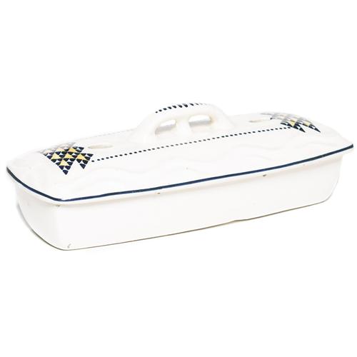 Austrian covered vessel, ceramic in white with a blue and yellow geometric design to lid, unmarked,9in.l, hairlines to rim of dish
