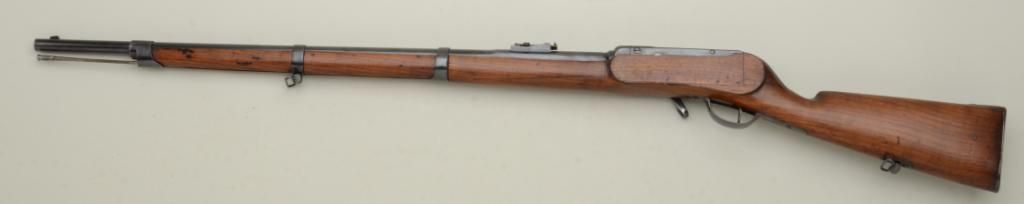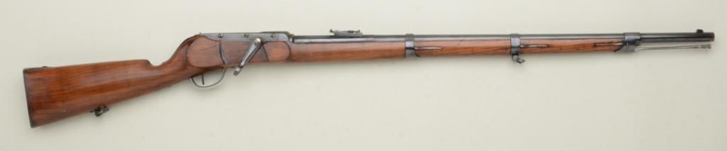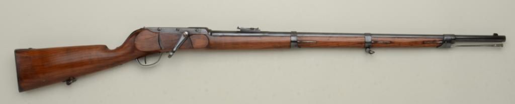 Austrian style falling block needlefire military type rifle, similar to a Werndl, 11mm cal., 32-1/2” barrel, old re-blued finish, sling swivels, iron cleaning rod, wood stock, SERIAL #1. This gun is inoverall good condition showing the majority of its old re-blued finish, very good bore and action, stock is also very good as restored; accompanied by four spare firing pins. An extremely rare form of needlefireand unique in design; possibly an experimental model and the only known example we’ve ever seen. Est.: $2,500-$3,500.