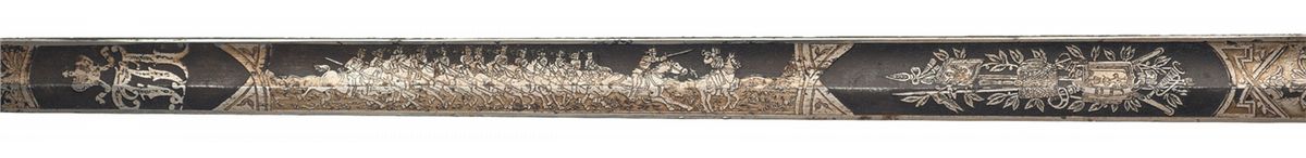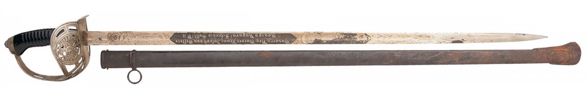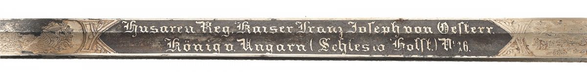 Measuring 35 inches overall, with a 29 7/8 inch etched single fuller blade with martial designs, "AHRENDT & KROGER SCHLESWIG" merchant mark on the spine, and an inscription to the 16th Schleswig-Holstein Hussars on the right. Cut-through nickel finished guard, with a folding counterguard and ribbed grip. With a metal scabbard marked "1.104" on the drag.