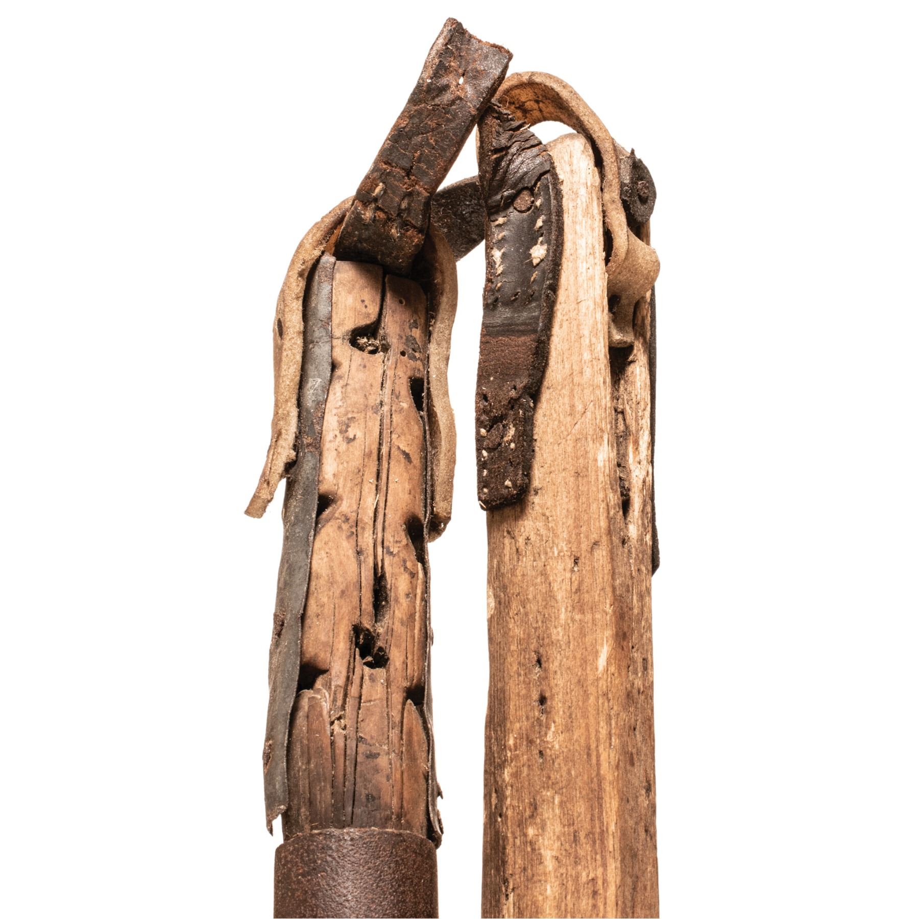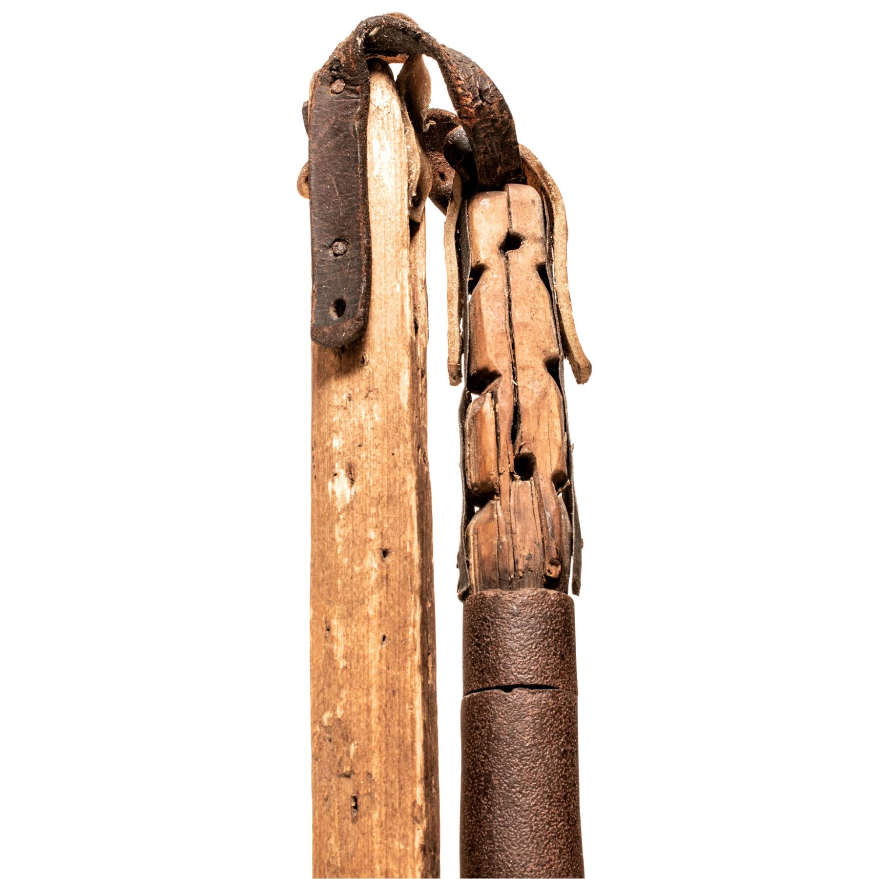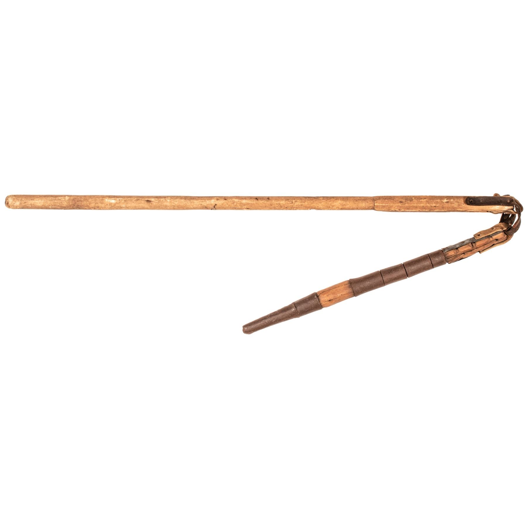 This original 16th Century “War Flail” measures about 62” overall, with the wooden handle section being 39” long and the Flail head measuring 22” long with a short flexible leather strap is held between the two sections. The Iron and wood surfaces are somewhat darken from age. The surface does have some areas of wear, still solid yet with expected age splits to the wood and having very old (centuries) reinforcement to the leather hinge. The lower handle section is connected to the six added sections of deep patina iron weights on this War Head, so as to inflict more damage to the opponent, connected with leather and sinew. At some later point in time, thin .75” wide tin straps were nailed onto both sides to support the heavy head. The six added heavy iron rings have a dark patina and the metal weighted end tapers to a 6.25” rounded point. An unusual type of weapon, rarely ever encountered in museums, as they would tend to be destroyed from use and deteriorate over time.