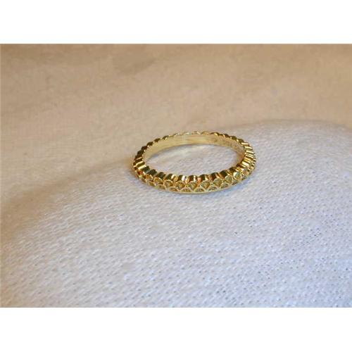 You are looking at a beautiful 18K yellow gold stacking ring. This stunning authentic piece features a continuous textured design in yellow gold. The design continues over the top of the ring while the bottom is a flat polished gold. The ring is stackable and looks great on either side of a straight center band. This piece was made by award winning designer Hidalgo. The band measures 1/8 of an inch wide. It is a size 6.5. Other sizes are available. The ring weighs 2.9 grams. It is in mint condition.
