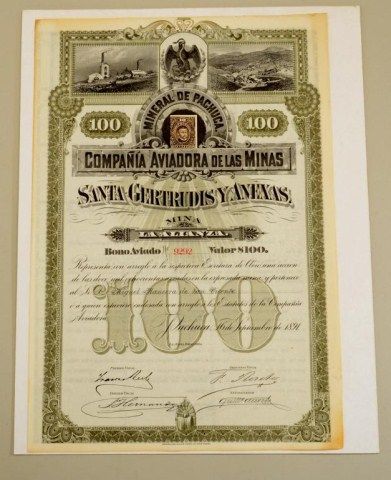 Authentic 1901-dated Mining shares document for the Santa Gertrudis Y Anexas Mina, approx. 14” x 18” in overall very good condition with outstanding artwork showing the snake and eagle at the top of thedocument along with the mining sight and works, period Diez Centavos stamp and signatures of the mine’s principals at the bottom of the front page of the document that was produced by the American Bank Note Co.of New York; would be interesting to further research the history of this mining venture. Est.: $75-$125.