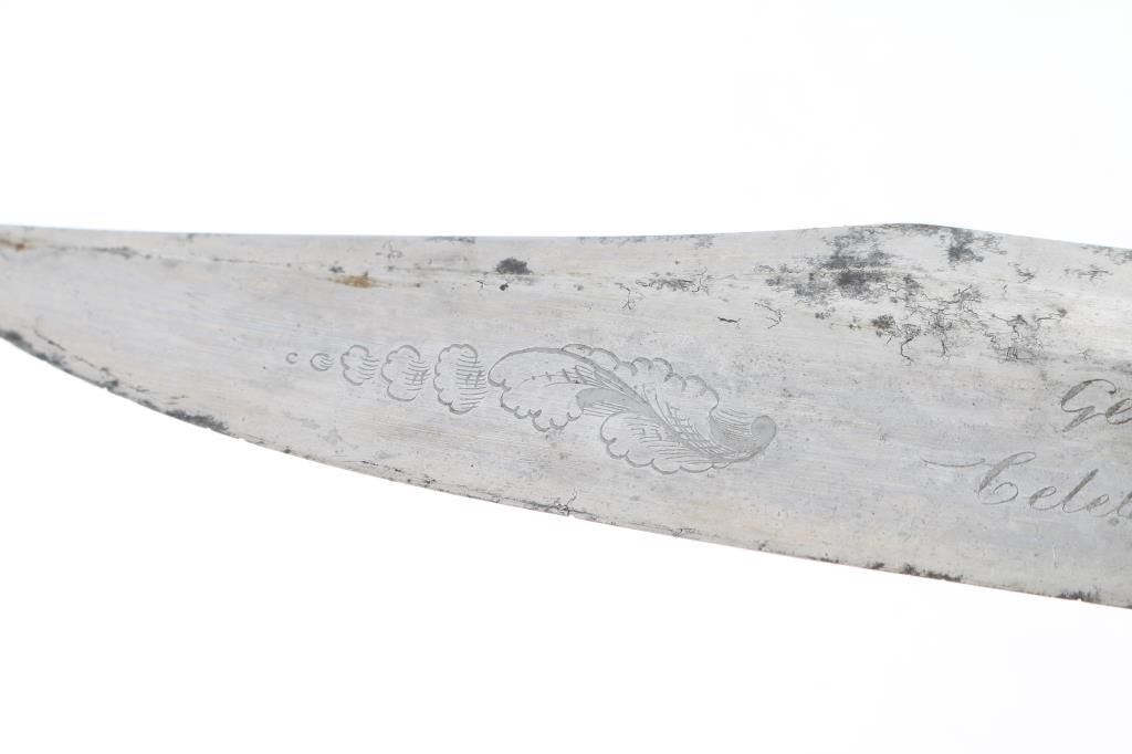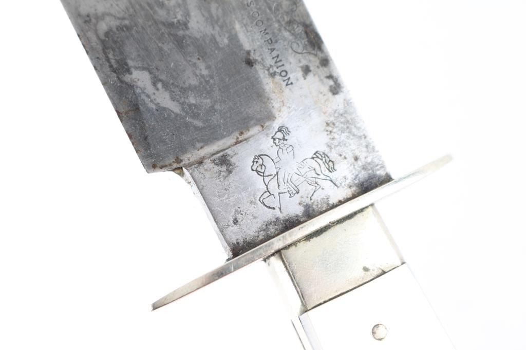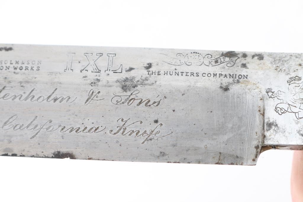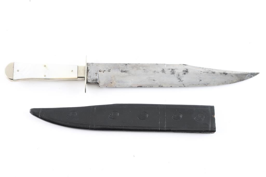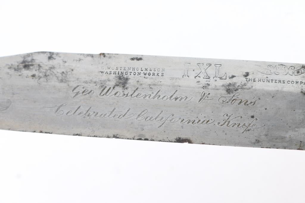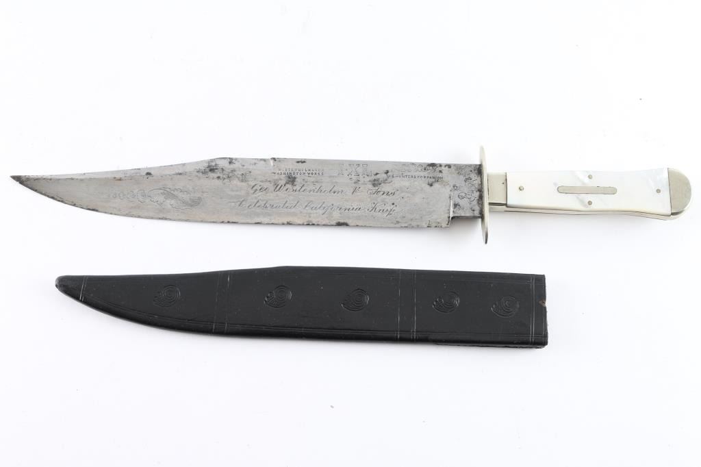 Knife marked G. Wostenholm & Son Washington Works, IXL, real IXL knife in banner above hunters companion. The center portion below median ridge hand engraved in script. "GEO WOSTENHOLM & SONS CELBRATED CALIFORNIA KNIFE". The ricasso is hot stamped with Zachary Taylor image on horseback. It has a semi coffin shaped tapered grip with pearl scales and German silver pins and mounts. The blade measures 10" and the knife is 14.5" overall. The condition is very good plus to near fine with full dimensions, most original lead polish just minor pitting and spots of erosion. Rating a 8 Plus on a 1-10 condition scale. A period leather scabbard without tip or throat is included showing line and shell embossed decoration also very good and fits well. A refined and desirable knife in exceptional condition circa 1850's.
