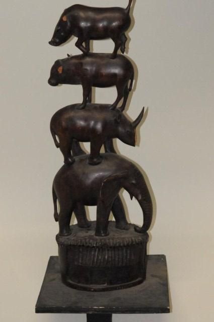 Authentic African carving of stacked animals measuring approx. 30-1/2” in height mounted on base with letters carved around base “Ukamba Nation Park” signed Mantheka. Some damage and losses. Some age nicely carved.From the Estate of Robert E. Peterson. Est.; $100-$300