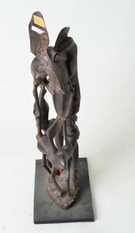Authentic African carving with a tag identifying “Devils birth and death” as the subject. Signed Morisi. Measures approx. 29” in height with some small chips. Shows some age in carving. Est.; $300-$600