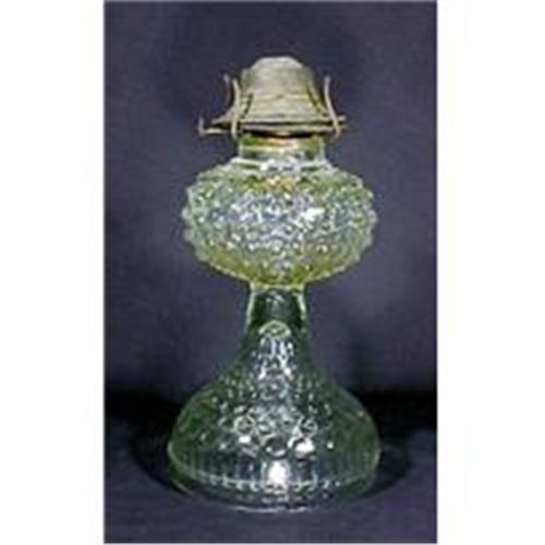 Lovely 19th century real authentic and genuine oil lamp. Blow in a mold in the hobnail pattern. It is interesting the hobnail pattern is on the exterior of the font and the hobnail pattern on the base is on the interior. It has the original old burner with it which is marked Banner and it has what I believe to be the original chimney that has a crimped edge matching exactly the hobnail pattern on the lamp. It is a very nice oil lamp indeed again authentic and in excellent condition ? not a chip or ding on it. It is ready to fill with oil or kerosene and you can exactly use this one! It measures 10? high (top of burner) with an overall diameter of 5?.