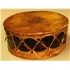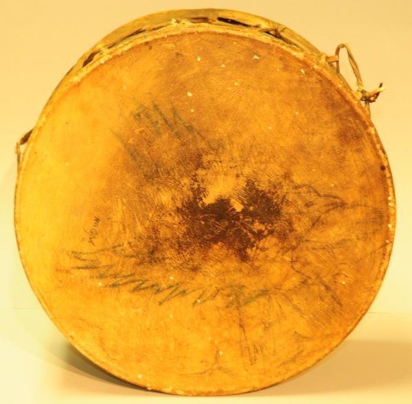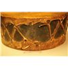 Rawhide covered kettle drum with faint bird design. With hand written provenance letter details that the drum was given to David Long (a card carrying member of the Cherokee Wolf Clan) by an Apache medicine man. The letter states the drum was handed down to the medicine man who had also been an Apache medicine man.
