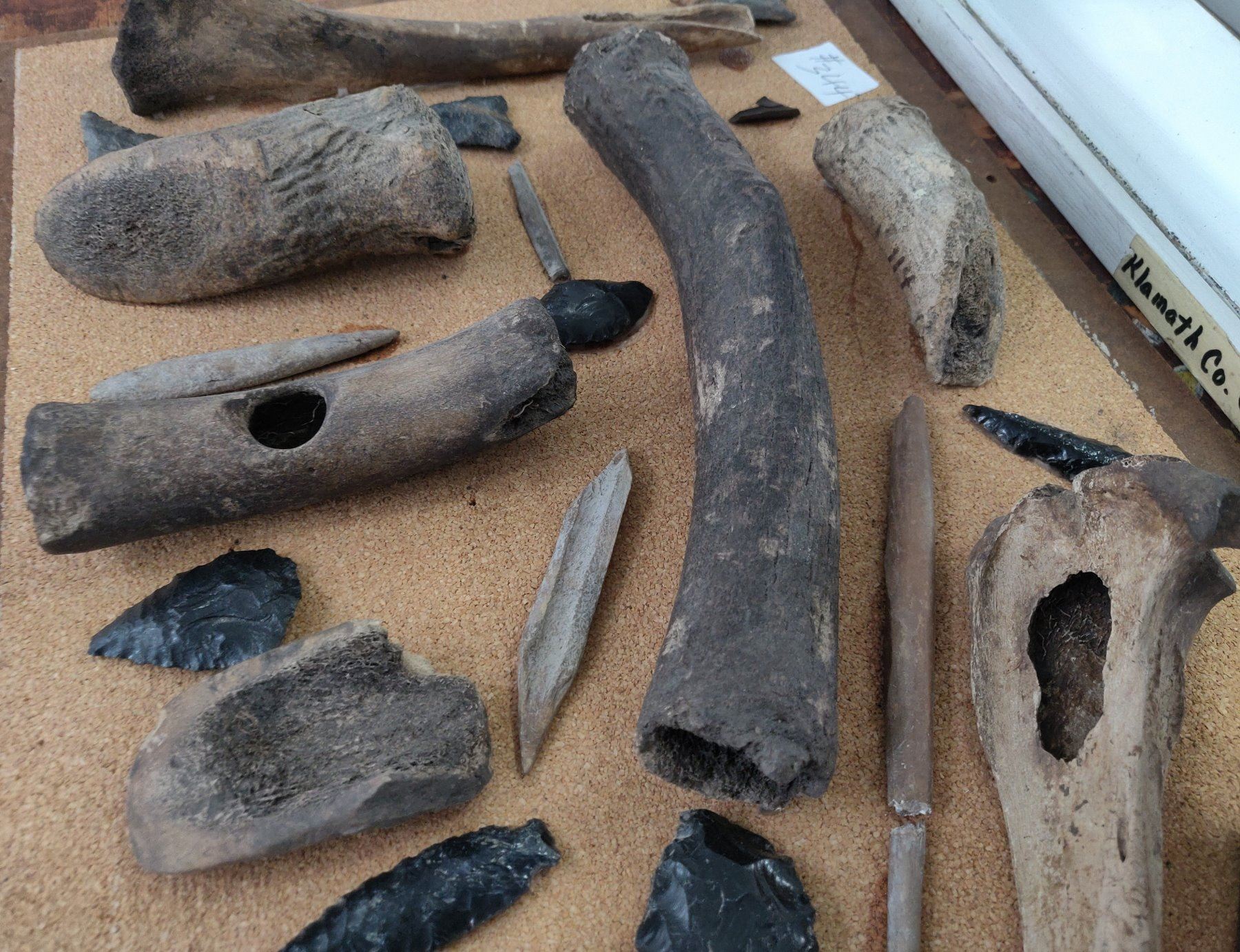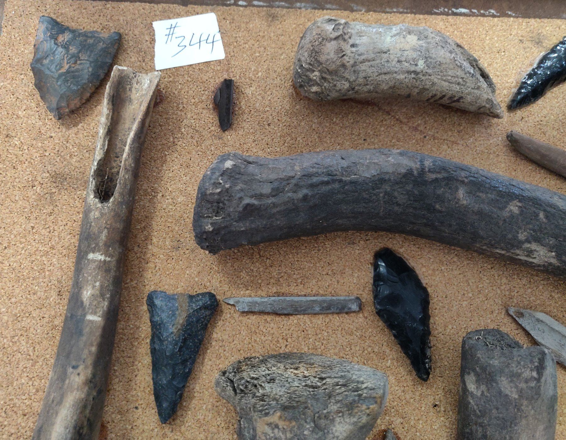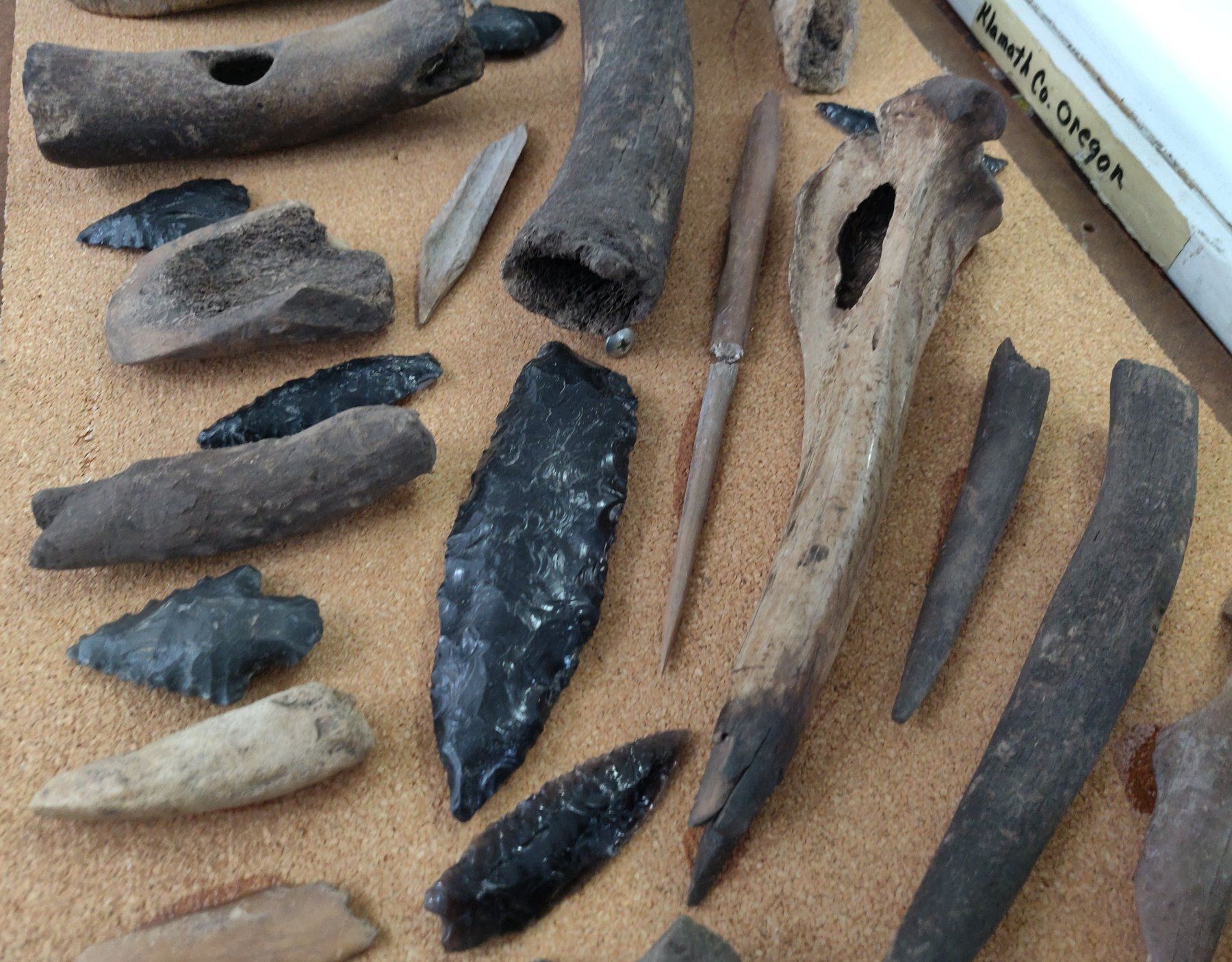 Authentic Artifact Collection, pre-historic items. Made of obsidian, antler and bone, the antler knife blade and handle measures 13". Klamath Falls, Oregon. Frame not included. Condition: As found, see images. Shipping: $45.00 w/insurance and signature, due to size, value and weight.
