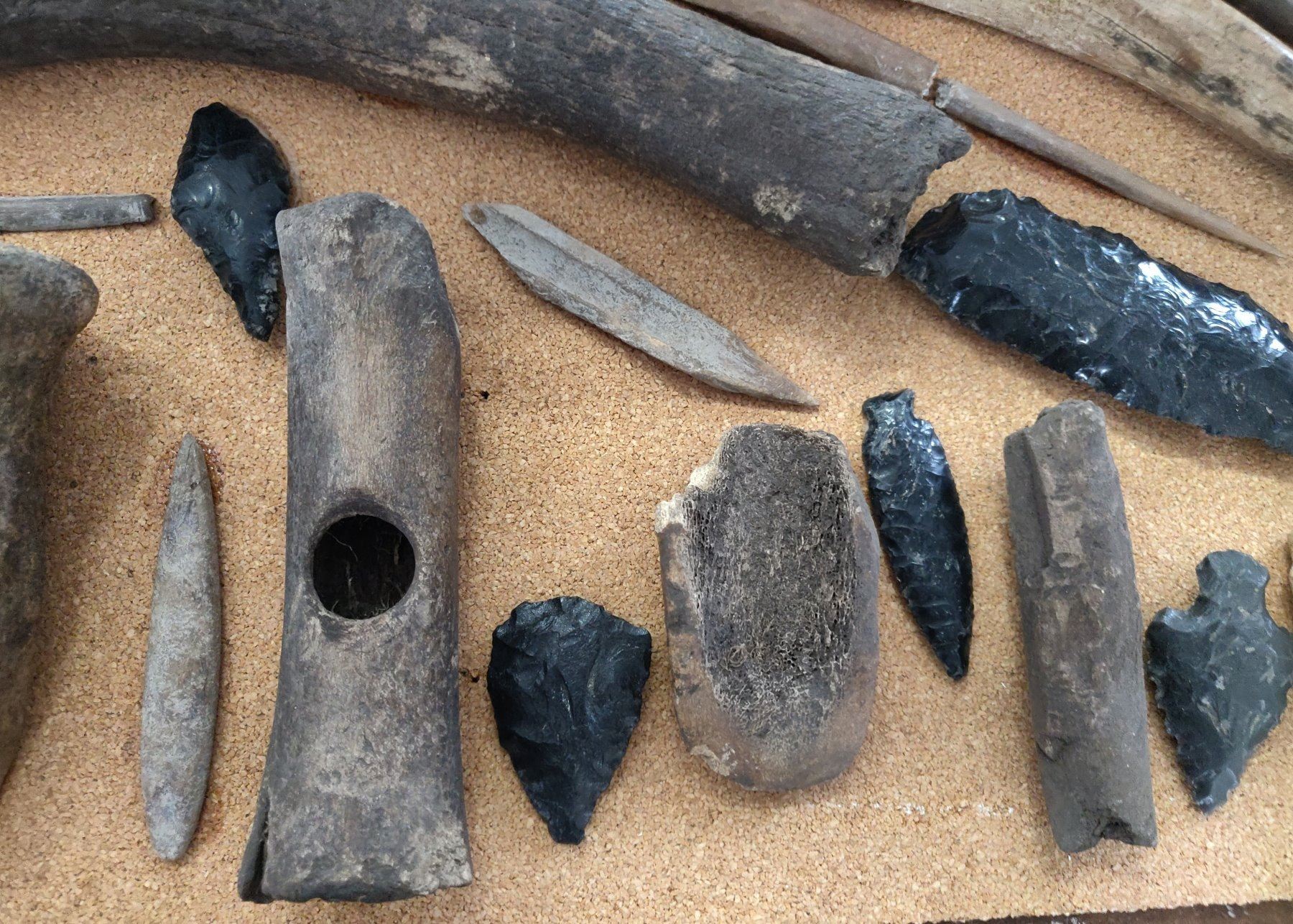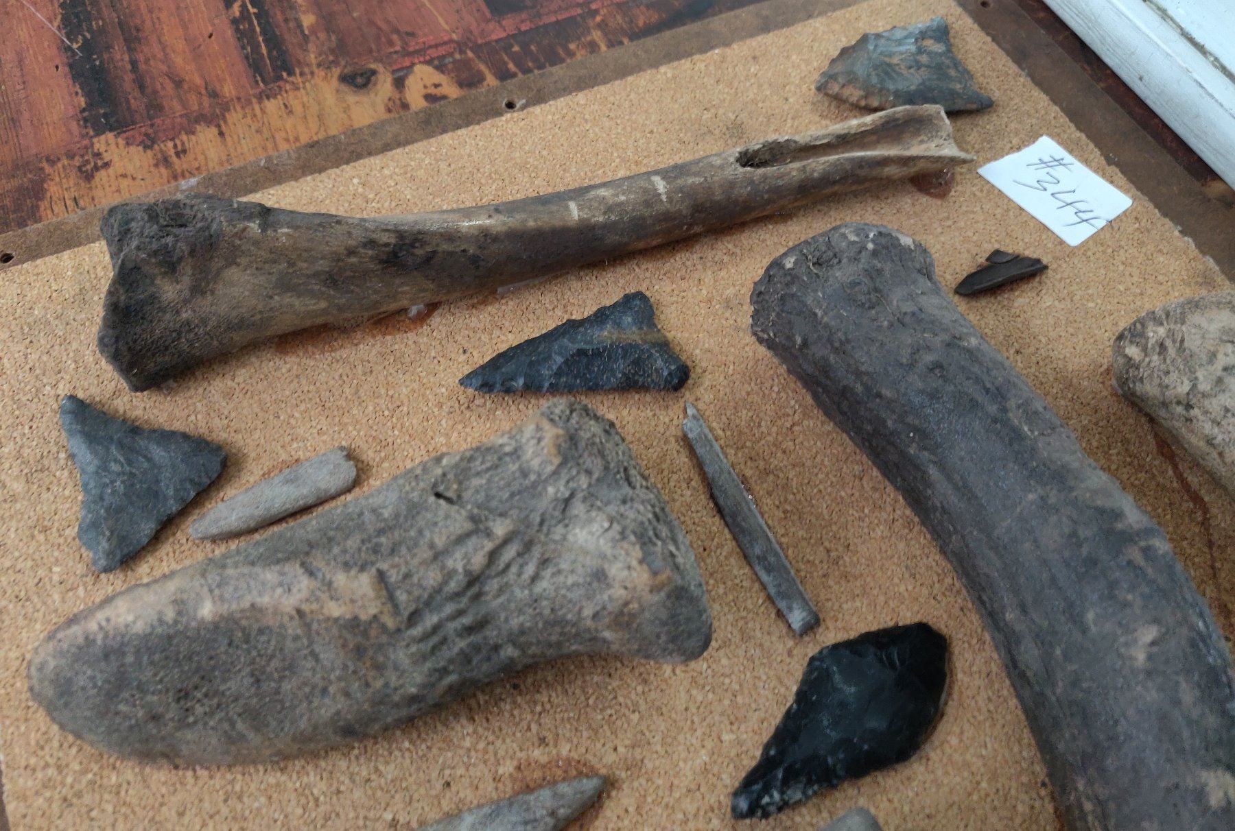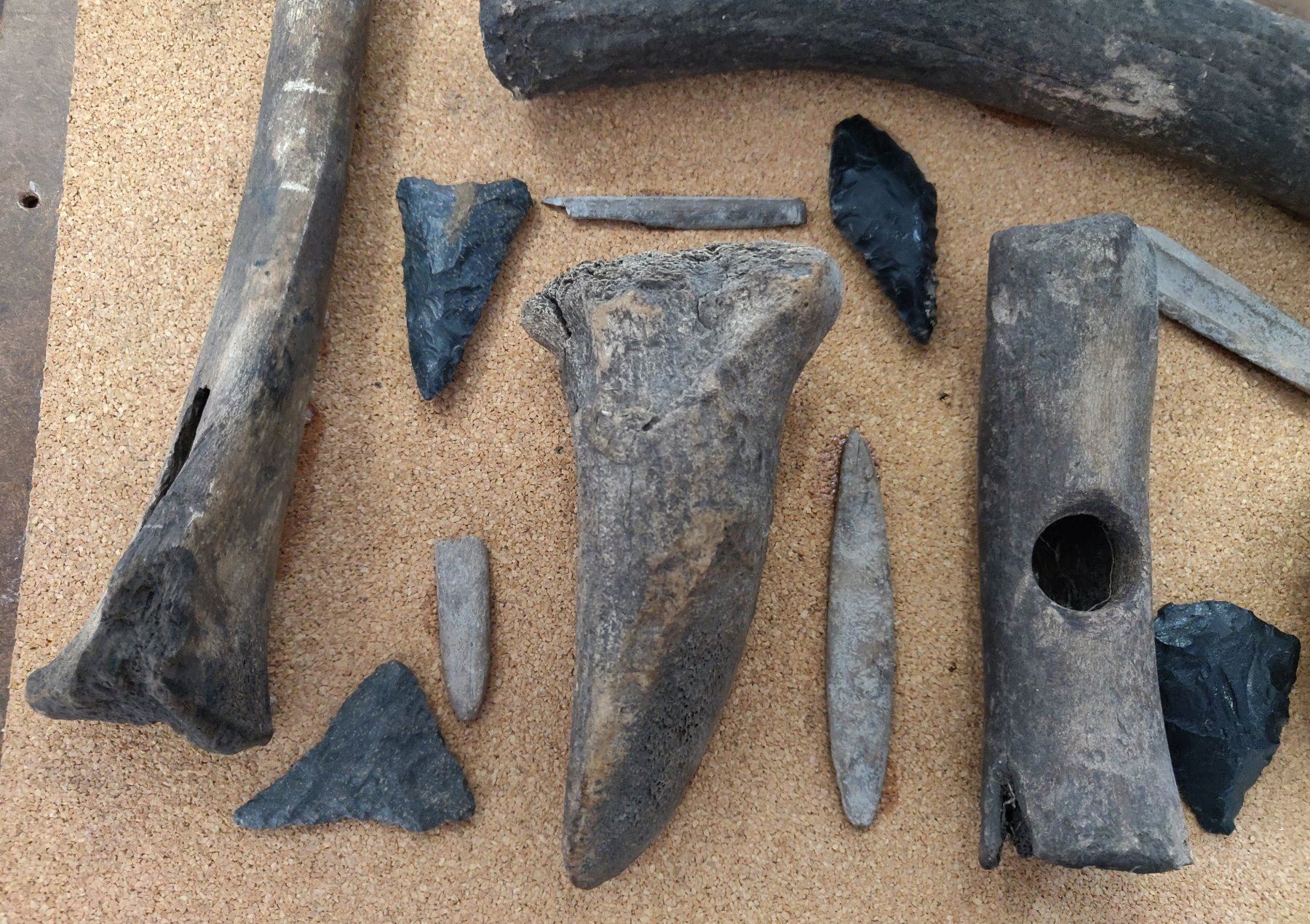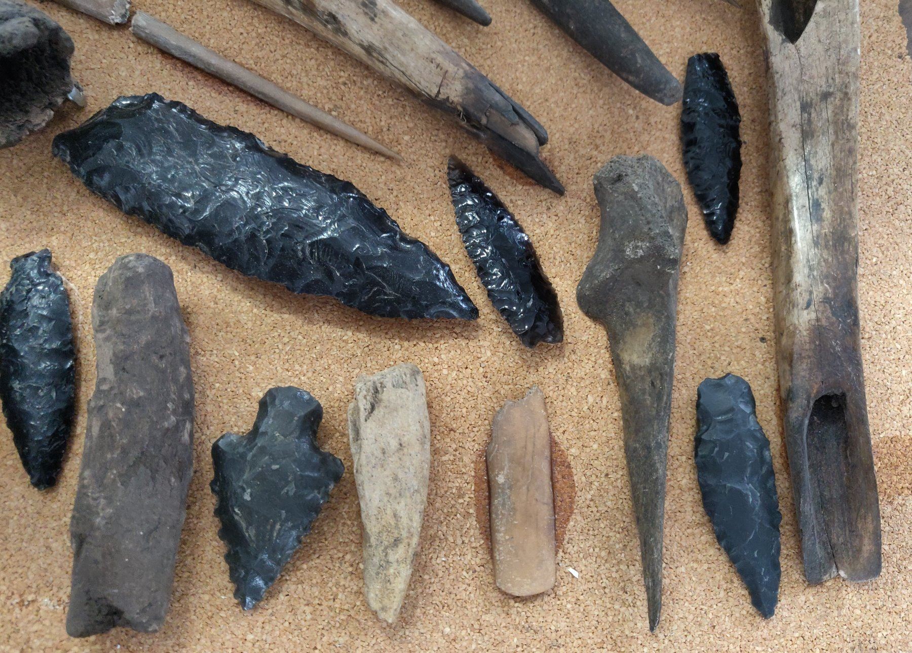 Authentic Artifact Collection, pre-historic items. Made of obsidian, antler and bone, the antler knife blade and handle measures 13". Klamath Falls, Oregon. Frame not included. Condition: As found, see images. Shipping: $45.00 w/insurance and signature, due to size, value and weight.