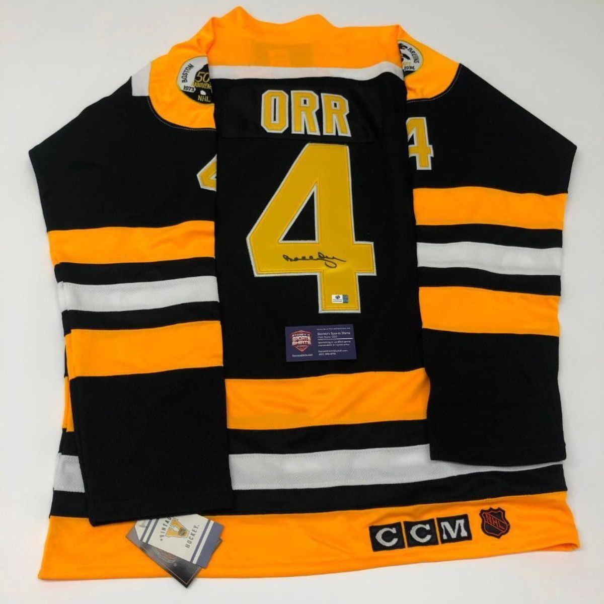 An Authentic Boston Bruins Bobby Orr #4 Autographed Jersey With COA. A Remarkable Signature From The Bobby Himself. Certified Authentic Boston Bruins Bobby Orr Jersey. An Excellent Addition To Any Sports Collection & A Must Have For A NHL Sports Collector. Records Most points in one NHL season by a defenceman (139; 1970–71) Most assists in one NHL season by a defenceman (102; 1970–71). Most 100-point seasons by a defenceman (1969-70 - 1974-75). Highest plus/minus in one NHL season (+124; 1970–71) Most assists in one NHL game by a defenceman (6; tied with Babe Pratt, Pat Stapleton, Ron Stackhouse, Paul Coffey and Gary Suter One of two players to win four major NHL awards in one season (Hart, Norris, Art Ross, and Conn Smythe in 1970), as well as the only player to win the Norris and Art Ross in the same season. The other was Alexandre Ovechkin in 2007-08. Fastest goal from start of overtime to clinch the Stanley Cup (0:40; 1970, game 4) View Photos For Further Details.