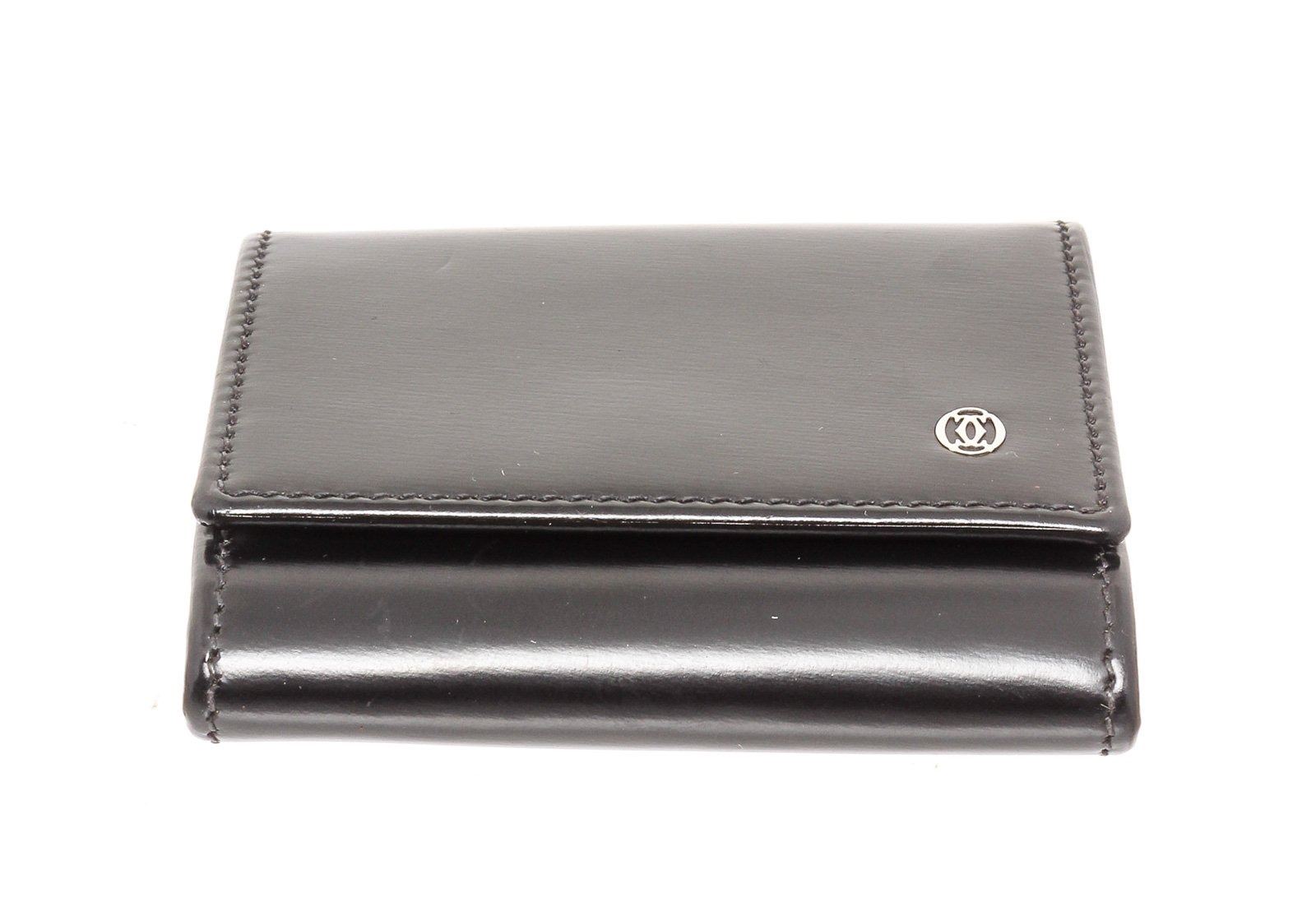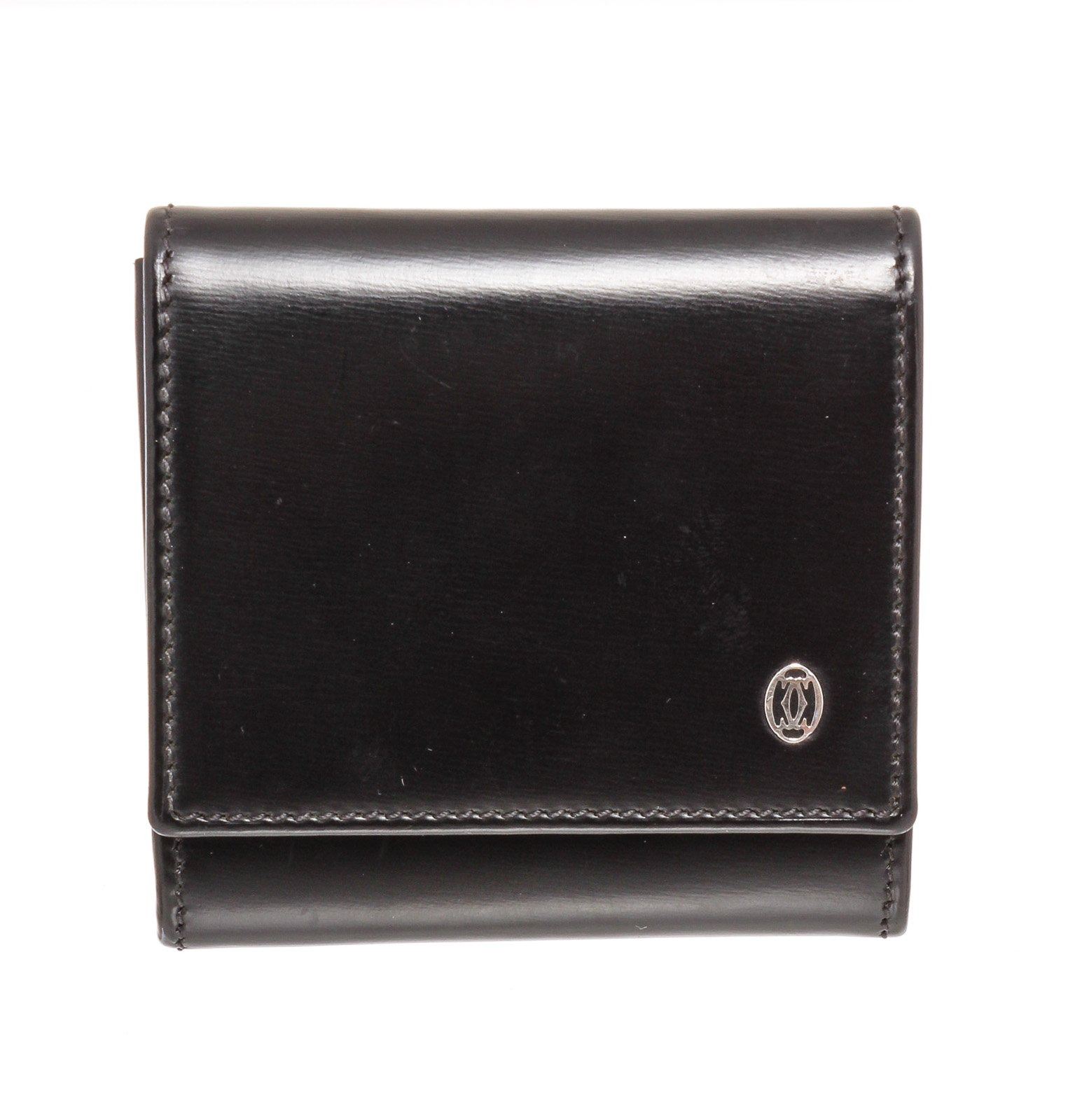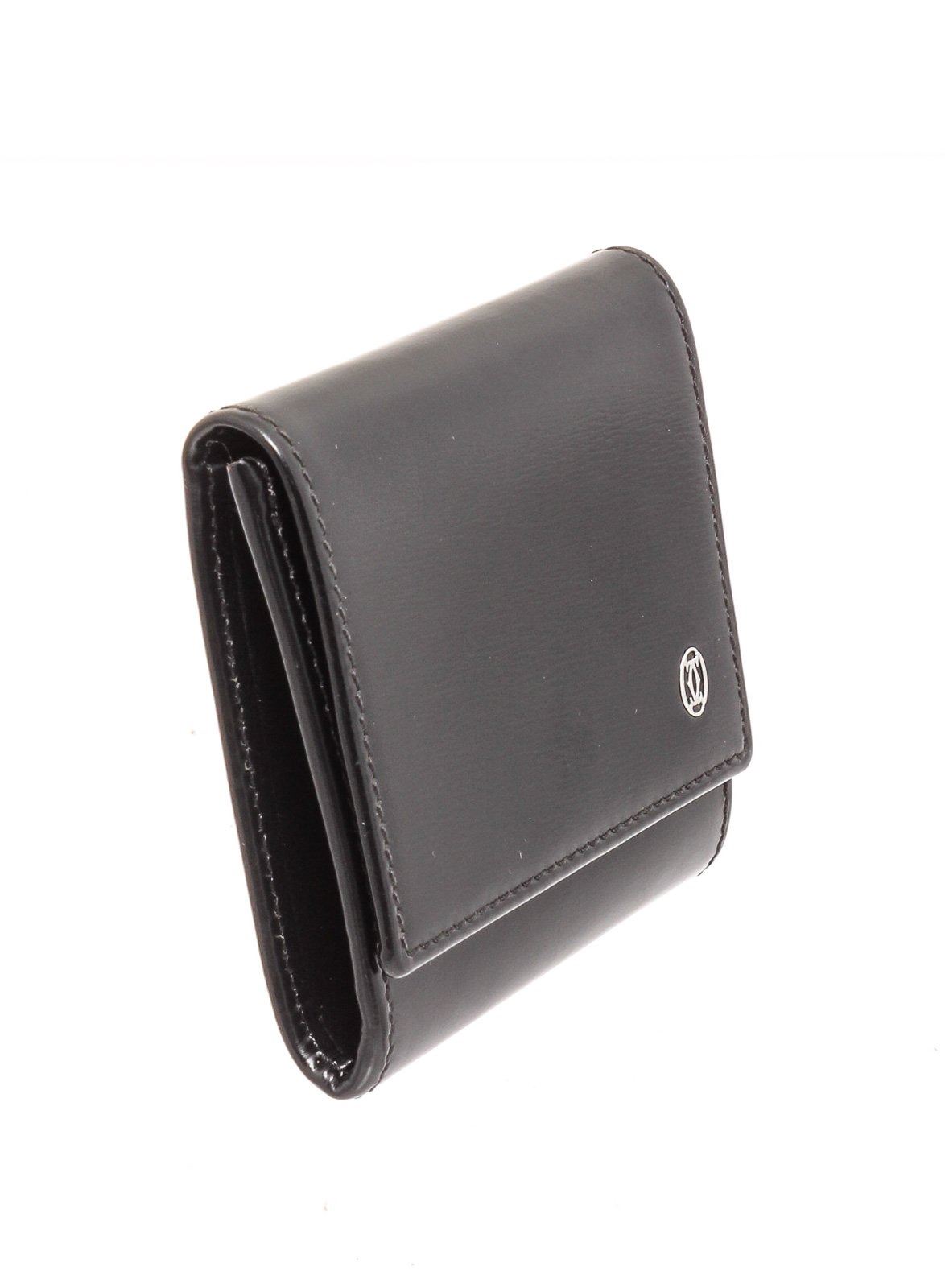 Cartier black leather coin purse wallet with silver-tone hardware, two interior compartments, and snap closure.