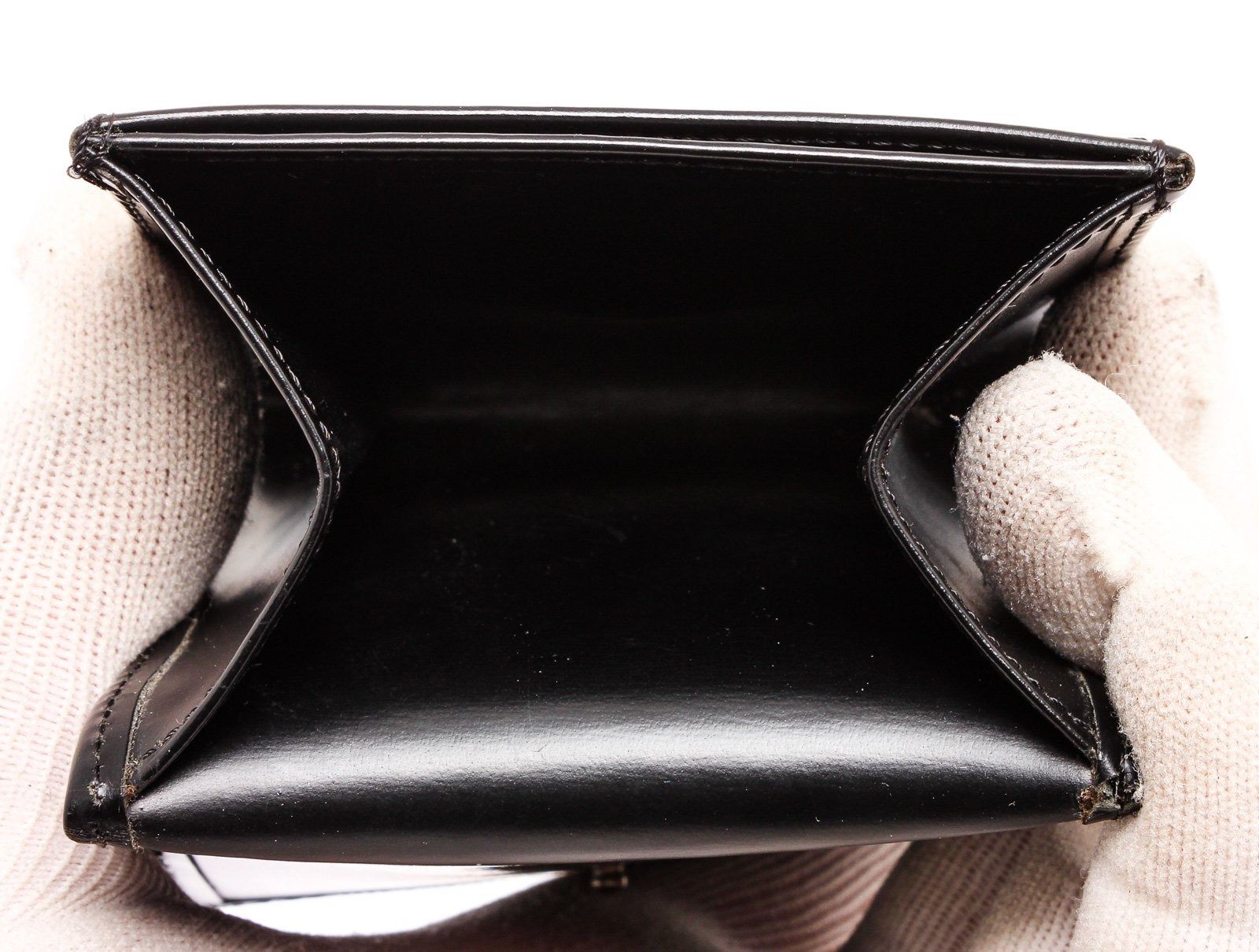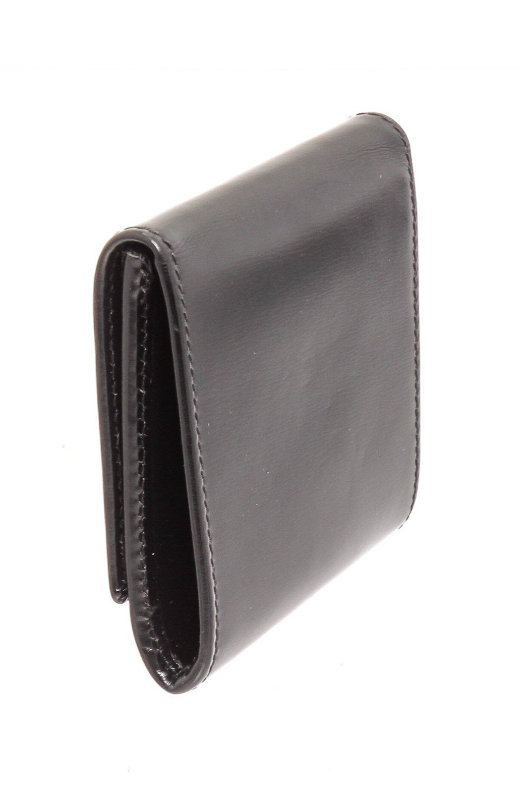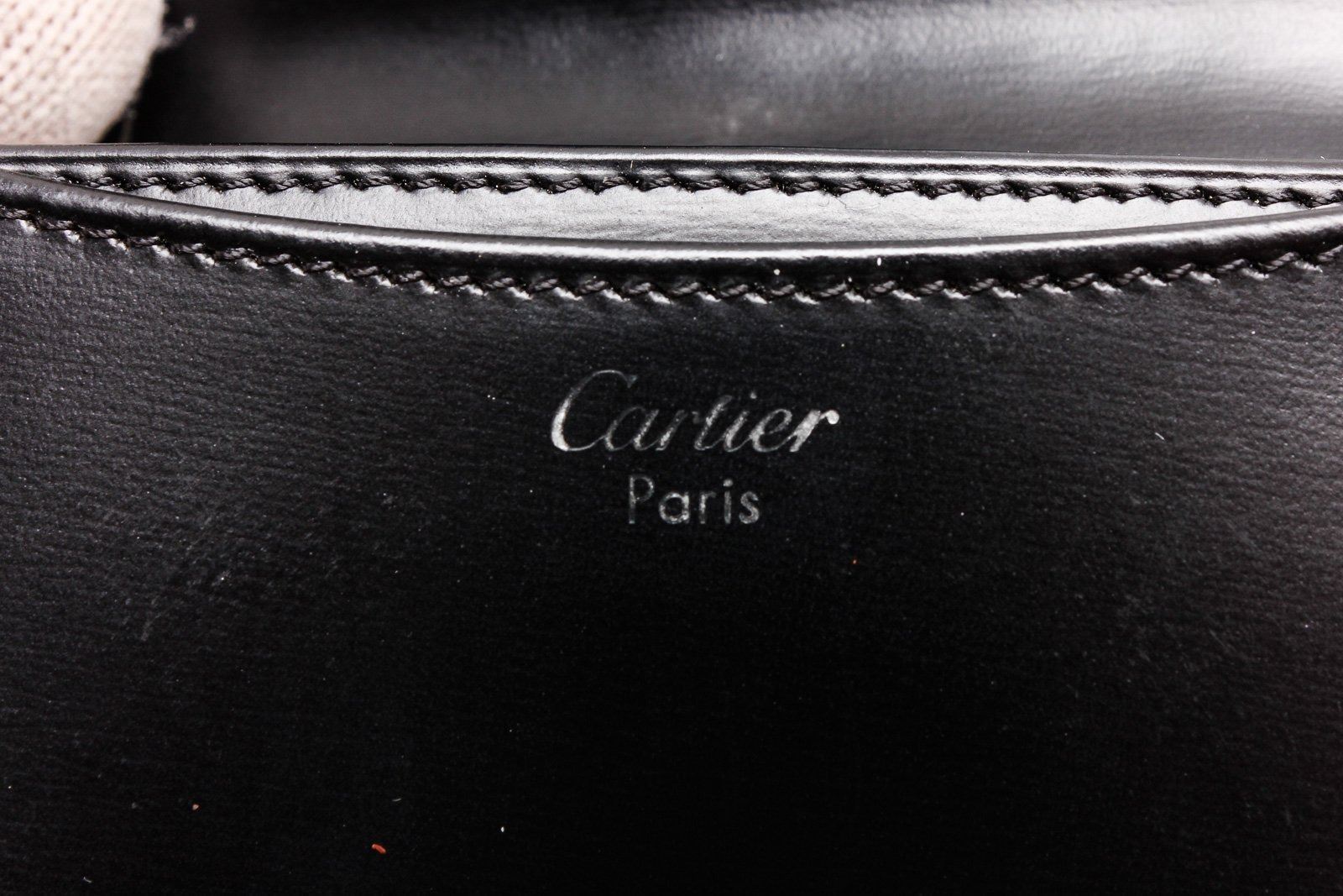 Cartier black leather coin purse wallet with silver-tone hardware, two interior compartments, and snap closure.