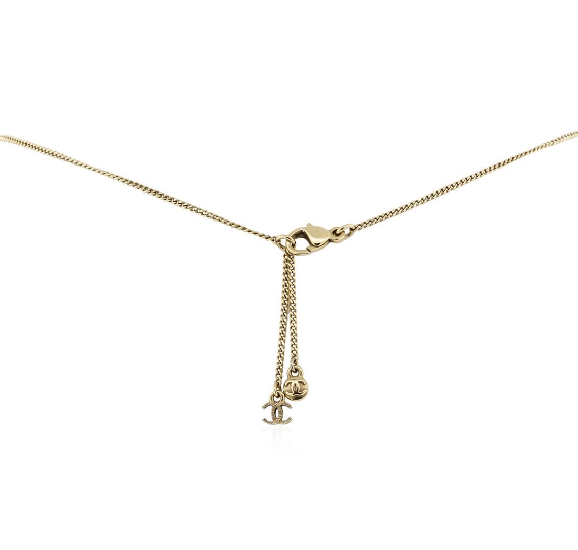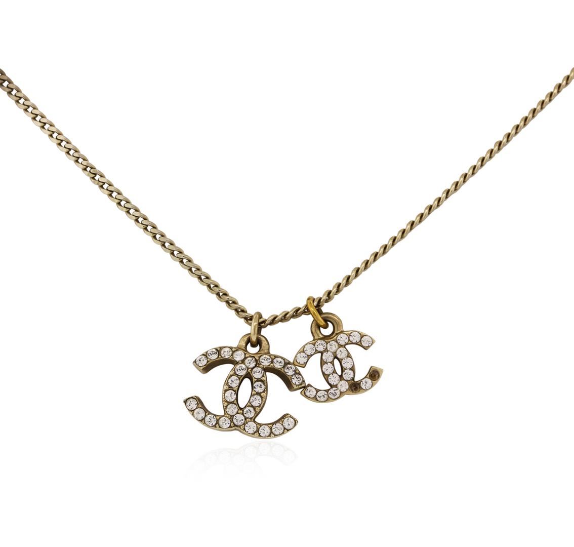 100% Authentic Chanel Double Logo Long Necklace. This beautiful designer necklace is made form a gold toned chain and features two signature Chanel interlocking CC logo charms. Both charms are adorned with shimmering crystals. The back of the necklace is beautiful as well. It features two ornate Chanel charms and an easy to use lobster claw clasp. Necklace can be worn long or clasped on the offered o-rings for different variations. This item was cared for by a previous owner but due to its vintage nature, the item shows signs of normal wear. Please see pictures. Comes with original Chanel box and tag.